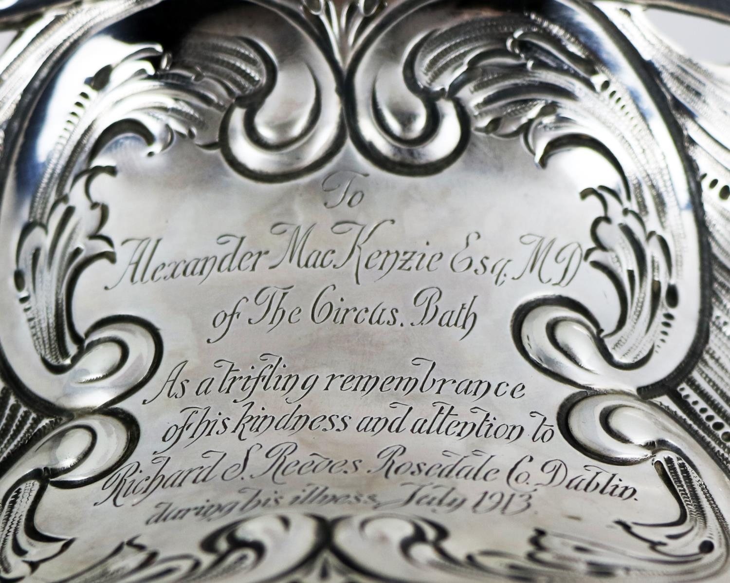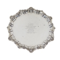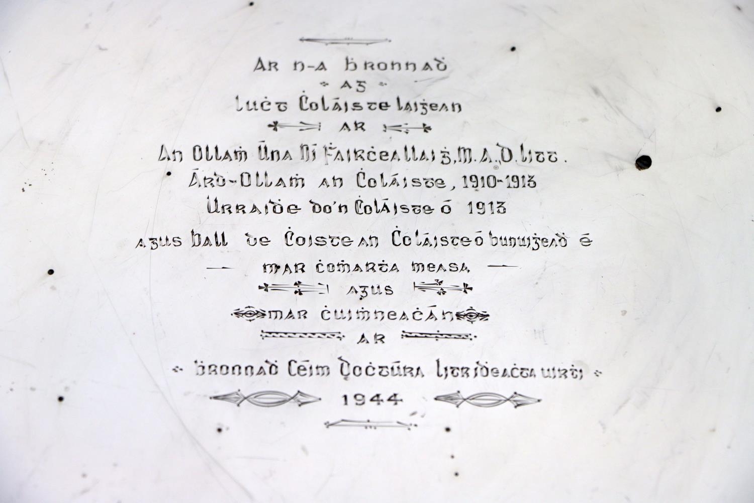 Silver: [Gaelic Interest, U.C.D. (Agnes O'Farrelly 1874-1951) A fine quality heavy Irish silver Salver, with shell decorated and shaped border, the plain centre engraved "Ar na Bhronnadh ag Lucht Colaiste Laighean ar an OUamh Una Ni Fhaircheallaigh M.A. D.Litt, ard Ollamh an Cholaiste 1910-1913, Urraidhe do n'Cholaiste O 1913 agus Ball de Choiste an Cholaiste OBunuigheadh i Mar Chomharthu Measa agus Mar Chuimhneachan ar bhronnadh Ceim Dochtura Litridheachta Uirti 1944" By Alwright & Marshall Ltd, approx. 40 ounces. (1)