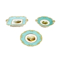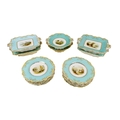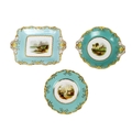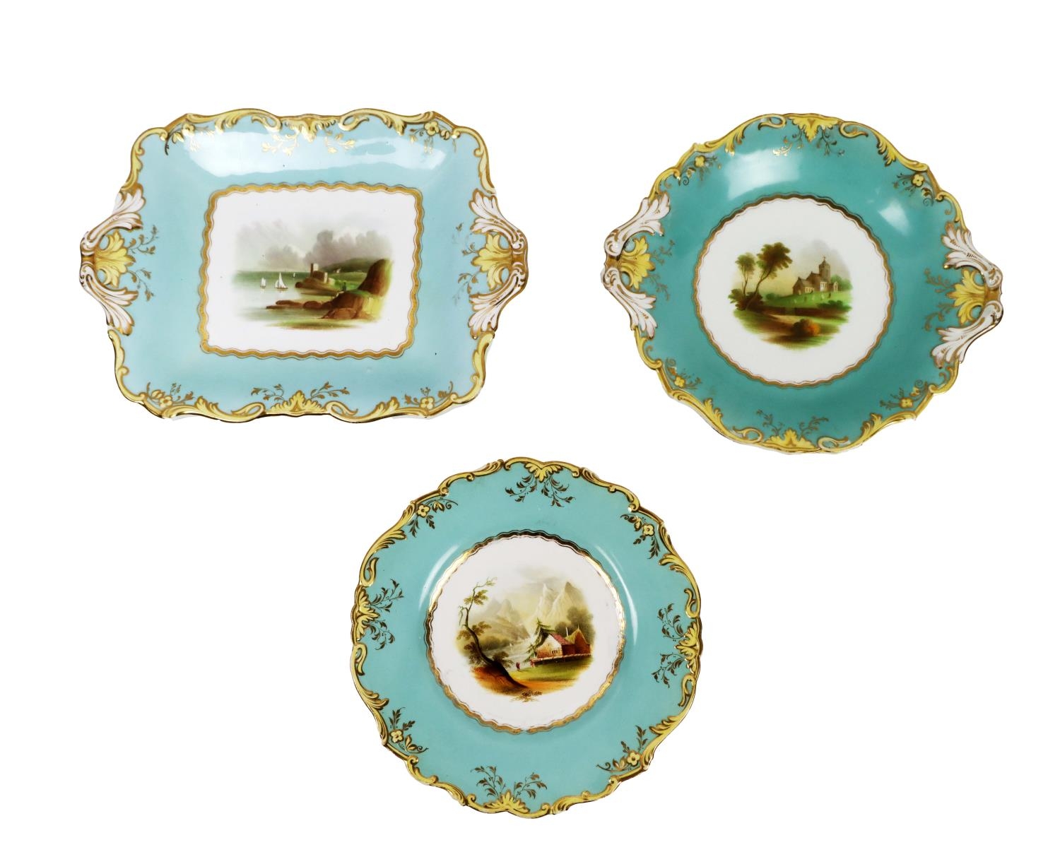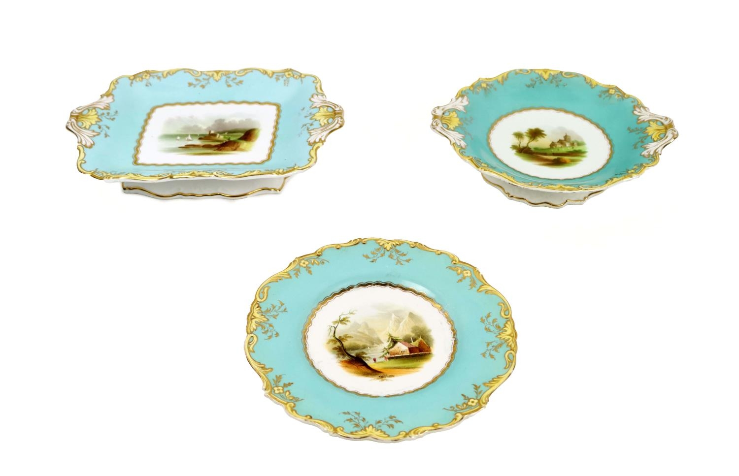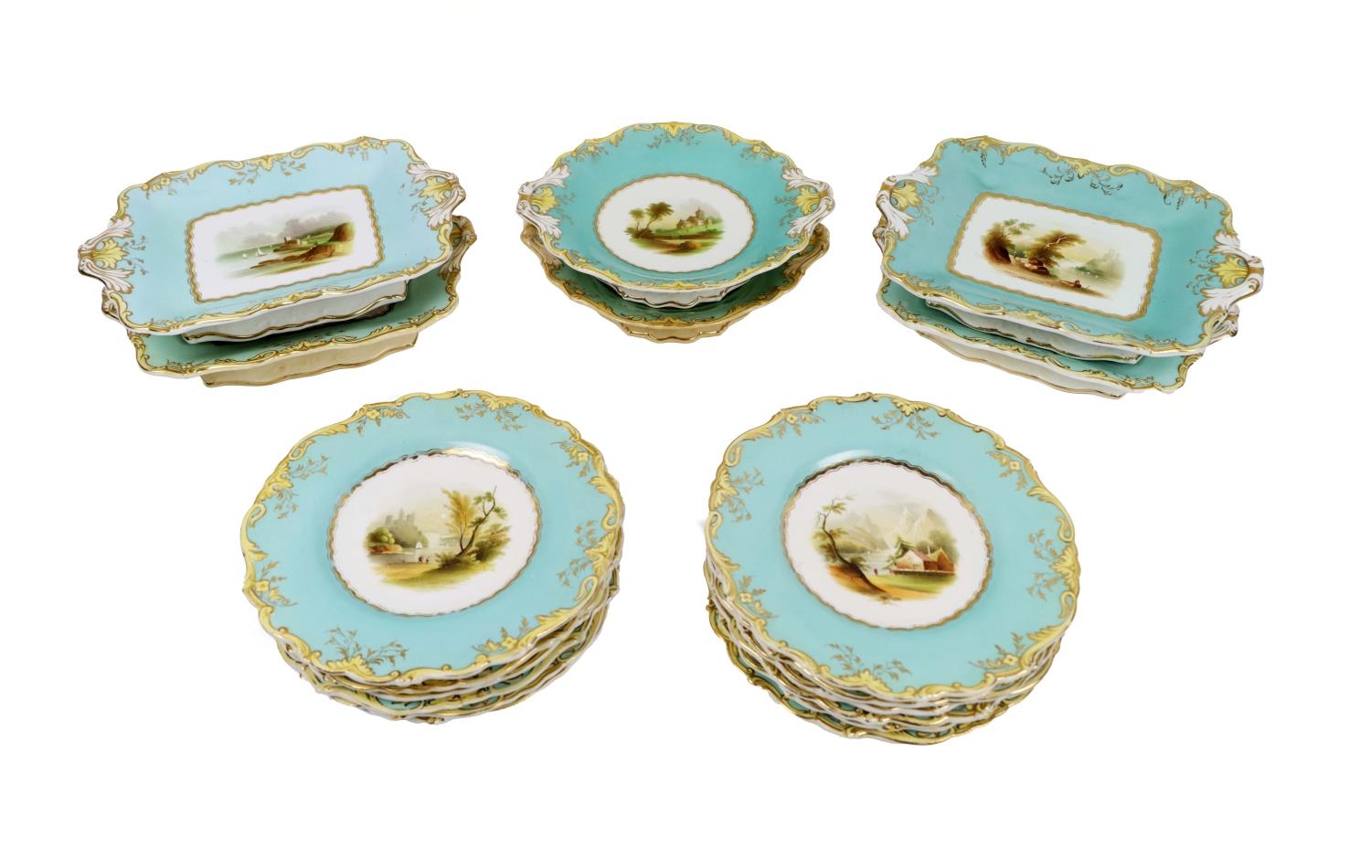 A large attractive 19th Century hand painted turquoise ground Dessert Service, 12 plates, 4 rectangular and 2 shaped circular comports, each painted with a different landscape scene, and with yellow and gilt borders, some faults, together 18 pieces, as a lot, w.a.f. (18)