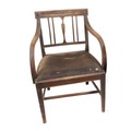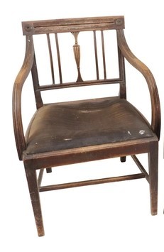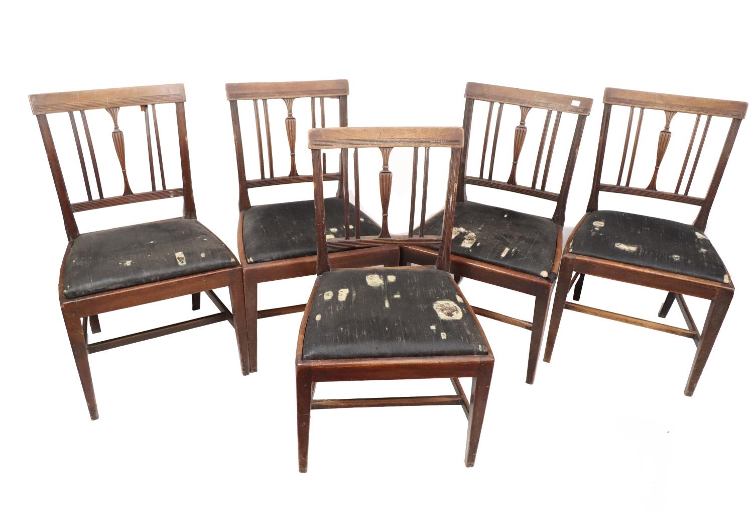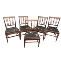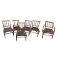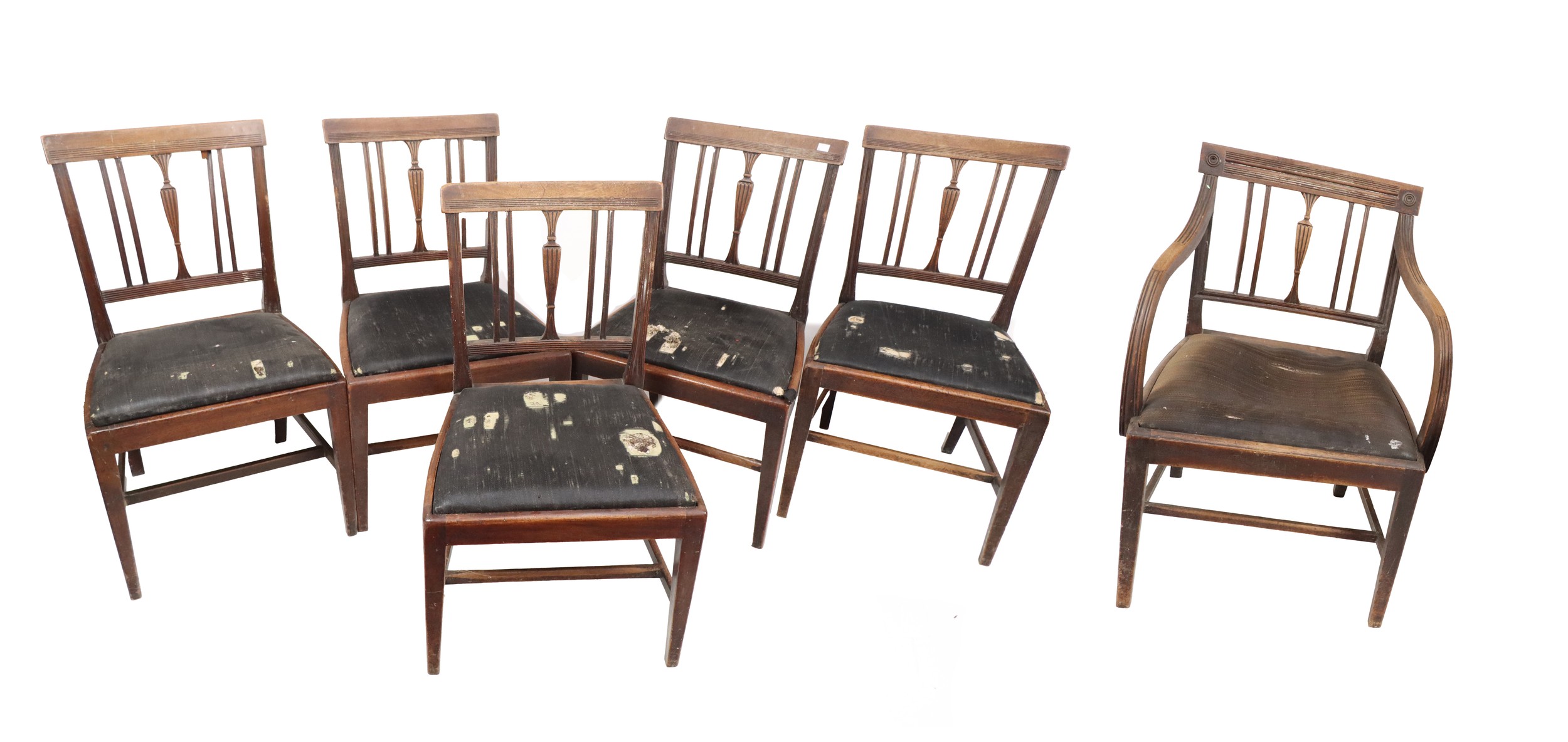 A set of 6 mahogany Dining Chairs, with latted backs and drop in seats; and matching mahogany Carver Armchair, with reeded latted back issuing S scroll arms above upholstered seat on front sabre legs. (6)