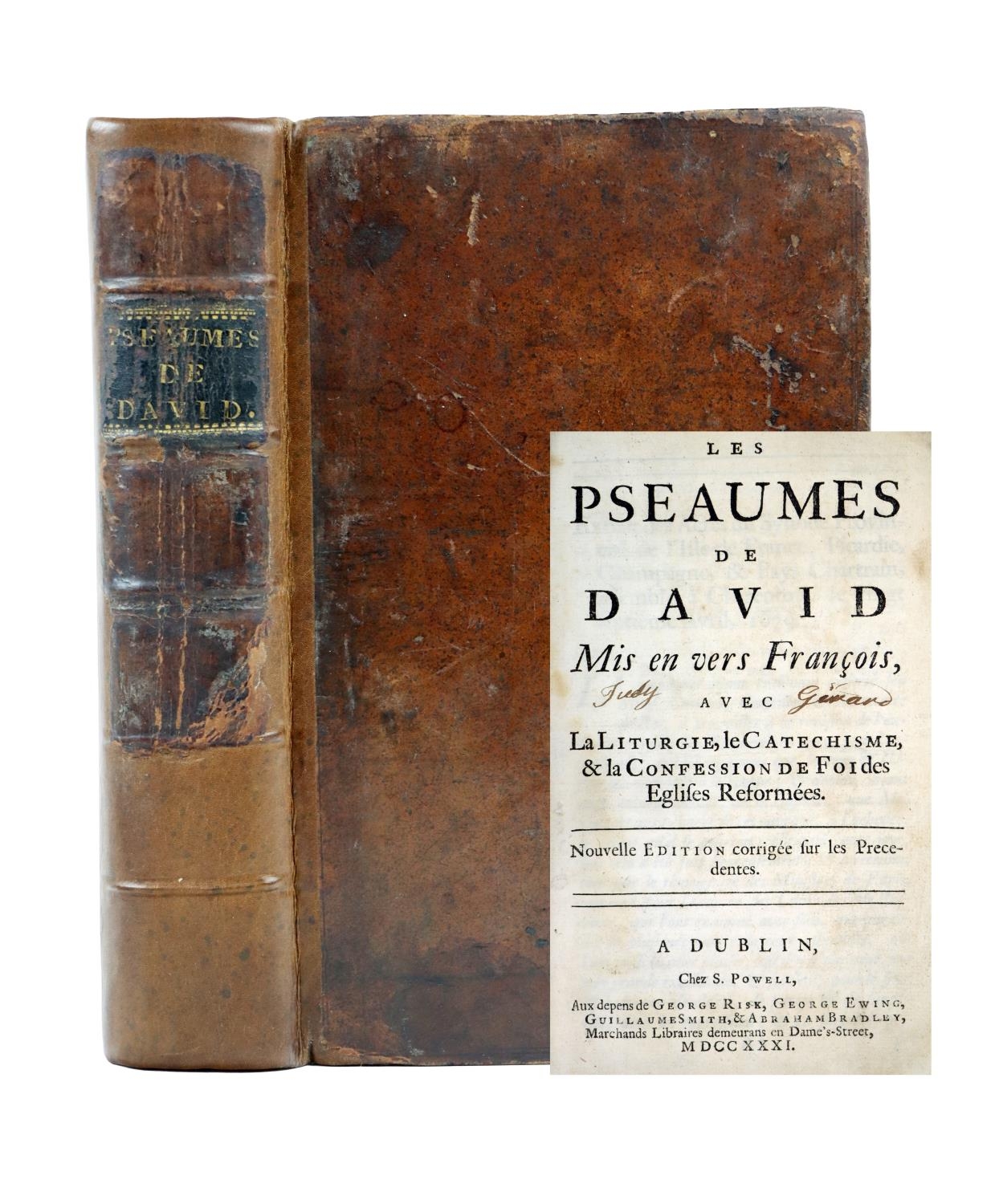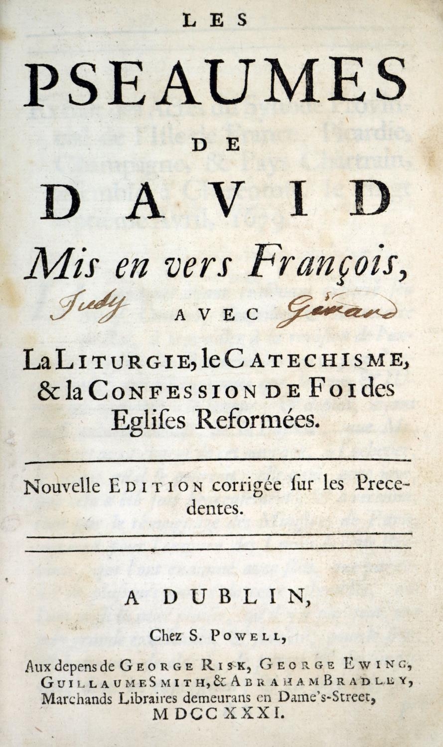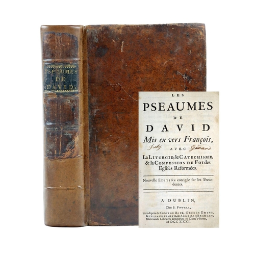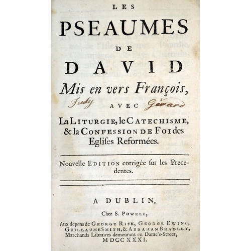 Dublin Printing: Les Pseaumes de David, Mis en vers Francois, avec La Liturgie, le Catechisme & la Confession de Foi des Eglises Reformees. 8vo Dublin (S. Powell) 1731. New Edn., Engd. frontis, some printed music, cont. calf, rebacked, in recent box. (1)