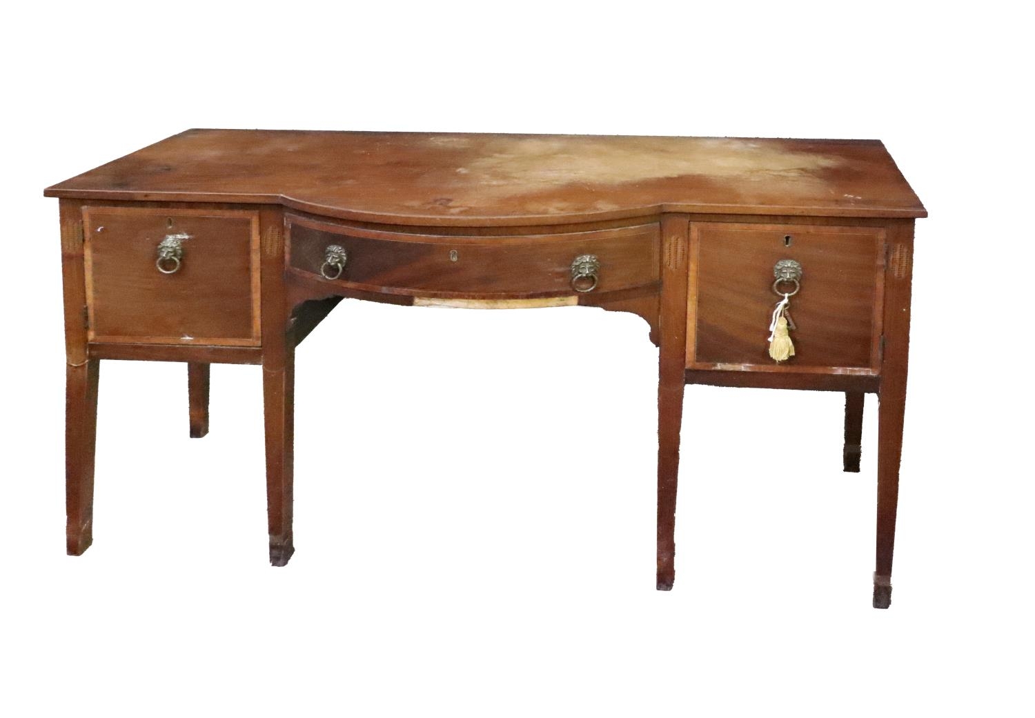 A 19th Century bow fronted Side Table, of small proportions with inlay and crossbanding and lion mask brass handles, 140cms (55") wide. (1)