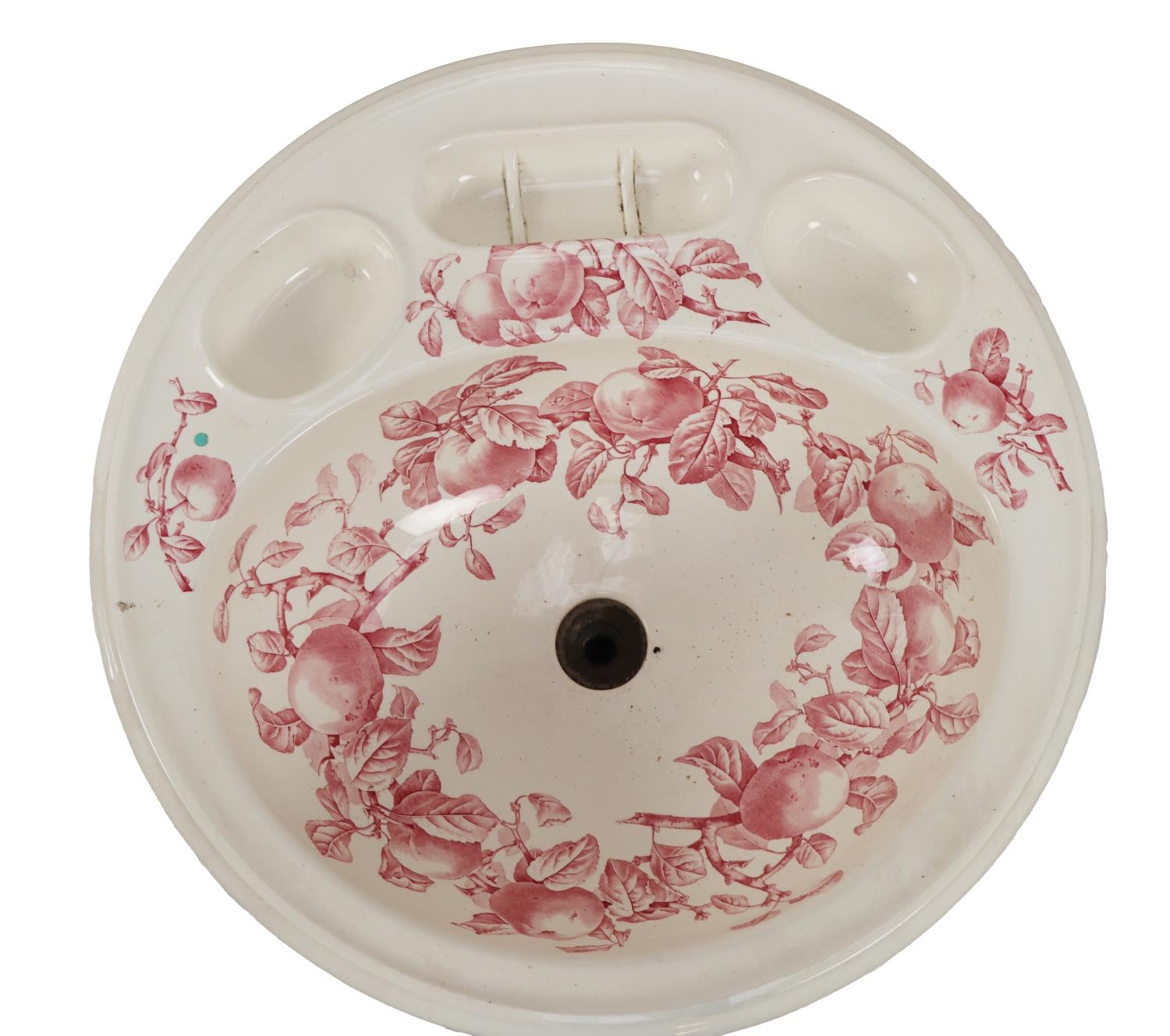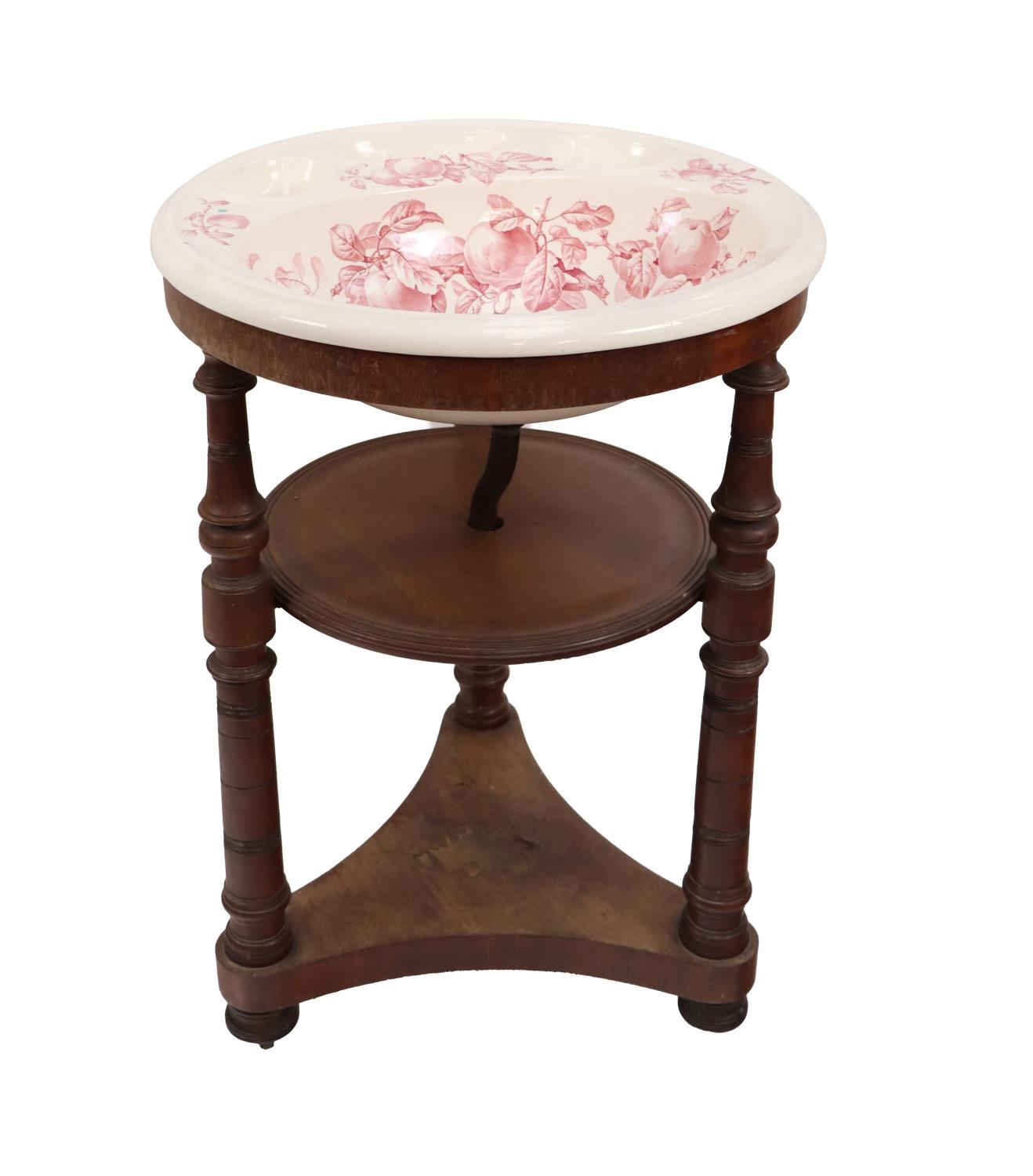 An Edwardian decorated porcelain Washstand, on mahogany base with turned pillar uprights. (1)