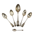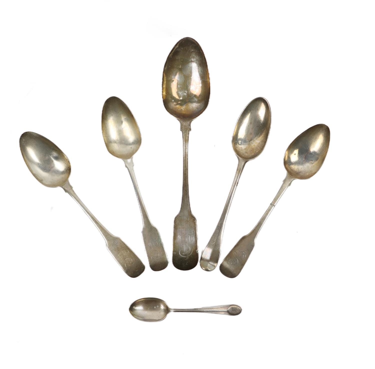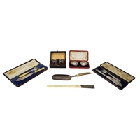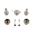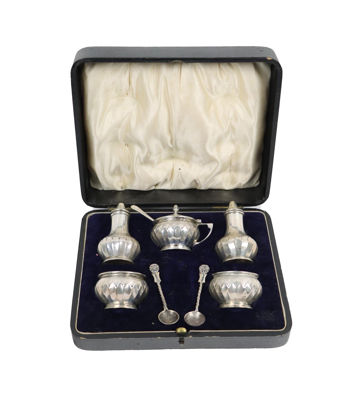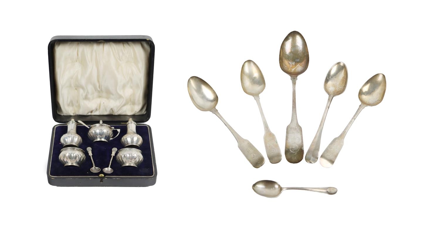 A silver cased Condiment Set, by Gorham Manufacturing Co., Birmingham, comprising salt and pepper, mustard pot and bowls, in original presentation box; together with six assorted Spoons, as a lot. (1)