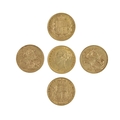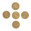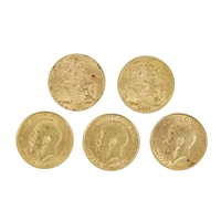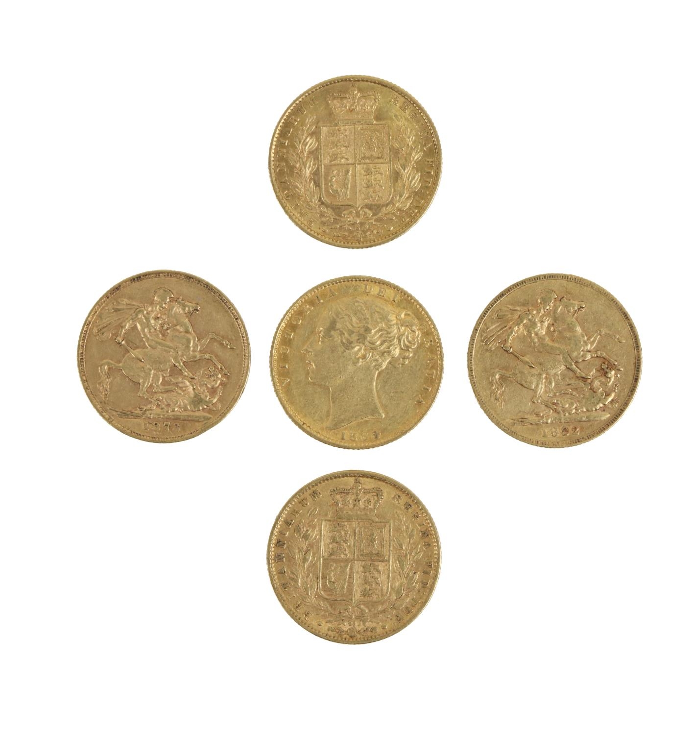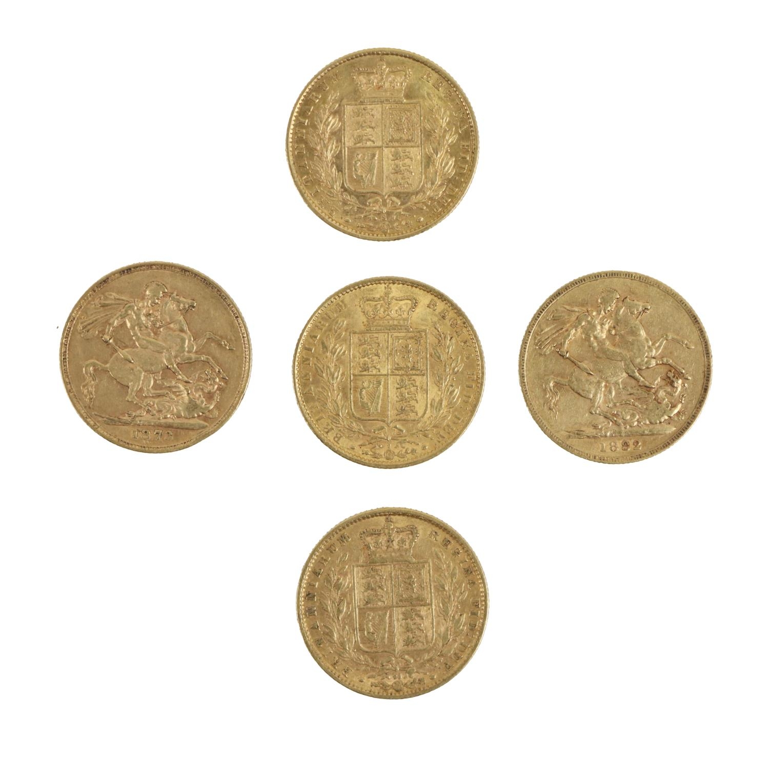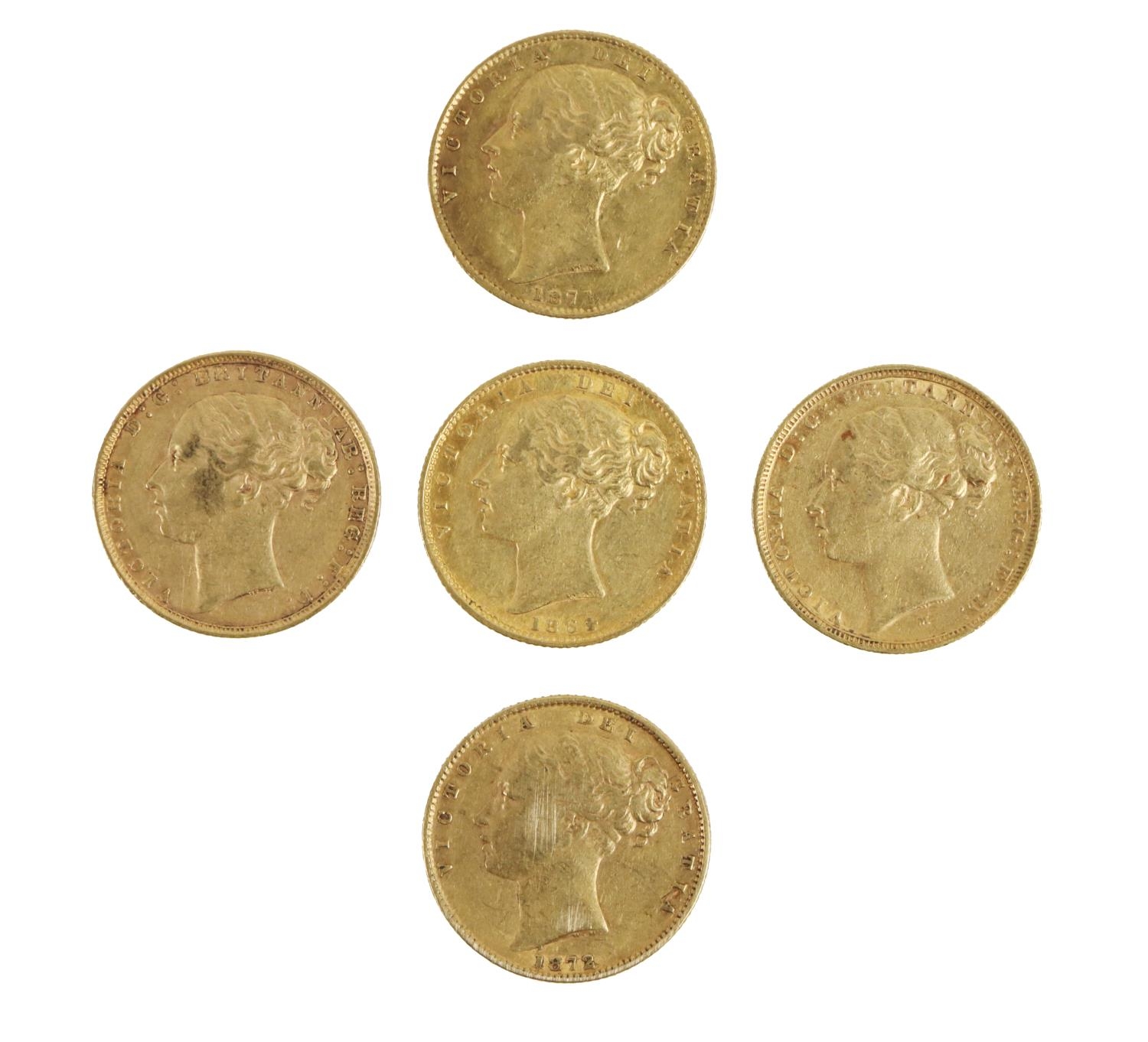 Gold Coins: A group of 5 Queen Victoria (young head) full Sovereigns, to include shield back 1864, 1871 & 1872, also George and the Dragon 1873 & 1882, as a collection, approx. 39.8 gms. (5)