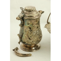 A pair of 19th Century Sheffield silver plated and leaf cast Candlesticks, each with baluster stem, on circular moulded foot, 28cms (11"); together with a small silver plated Beaker, a baluster shaped silver plated Pint Tankard, another plated Pint Tankard, a plated Cream Jug, and a small Quart Tankard. (7)