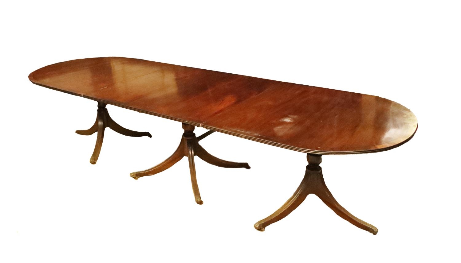 A Georgian style ebony strung inlaid mahogany D end pod Dining Table, with reeded side on brass caps on outsplayed legs, approx. 300cms long x 107cms wide (118" x 42"). (1)