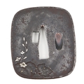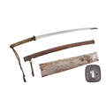 Militaria: A fine quality 19th Century Japanese Samurai Sword, the handle with shark skin base, ornate brass mounts, and original string grip cover, the square tang with decorative silver highlights and calligraphy, (handle marked underneath) issuing steel blade, housed in original leather scabbard, approx. 74cms (29") long. (1)