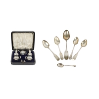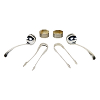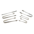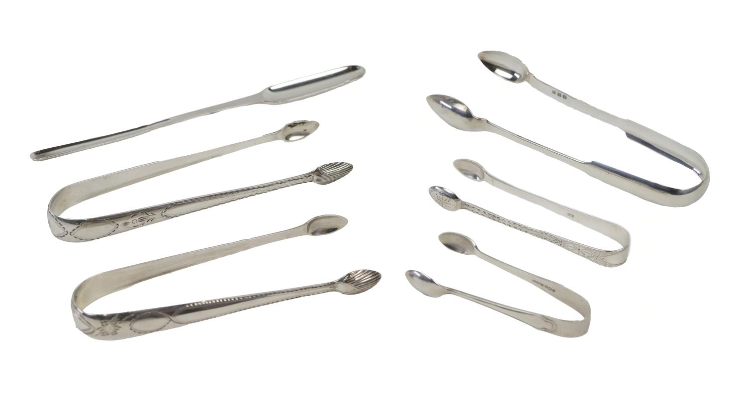 Silverware: A collection of Irish and English silver Sugar Tongs, of plain and bright cut design and of variant sizes (by Richard Garde, Cork & others), also an Irish Georgian Marrow Scoop (marks worn) approx. 6 ounces overall. (1)