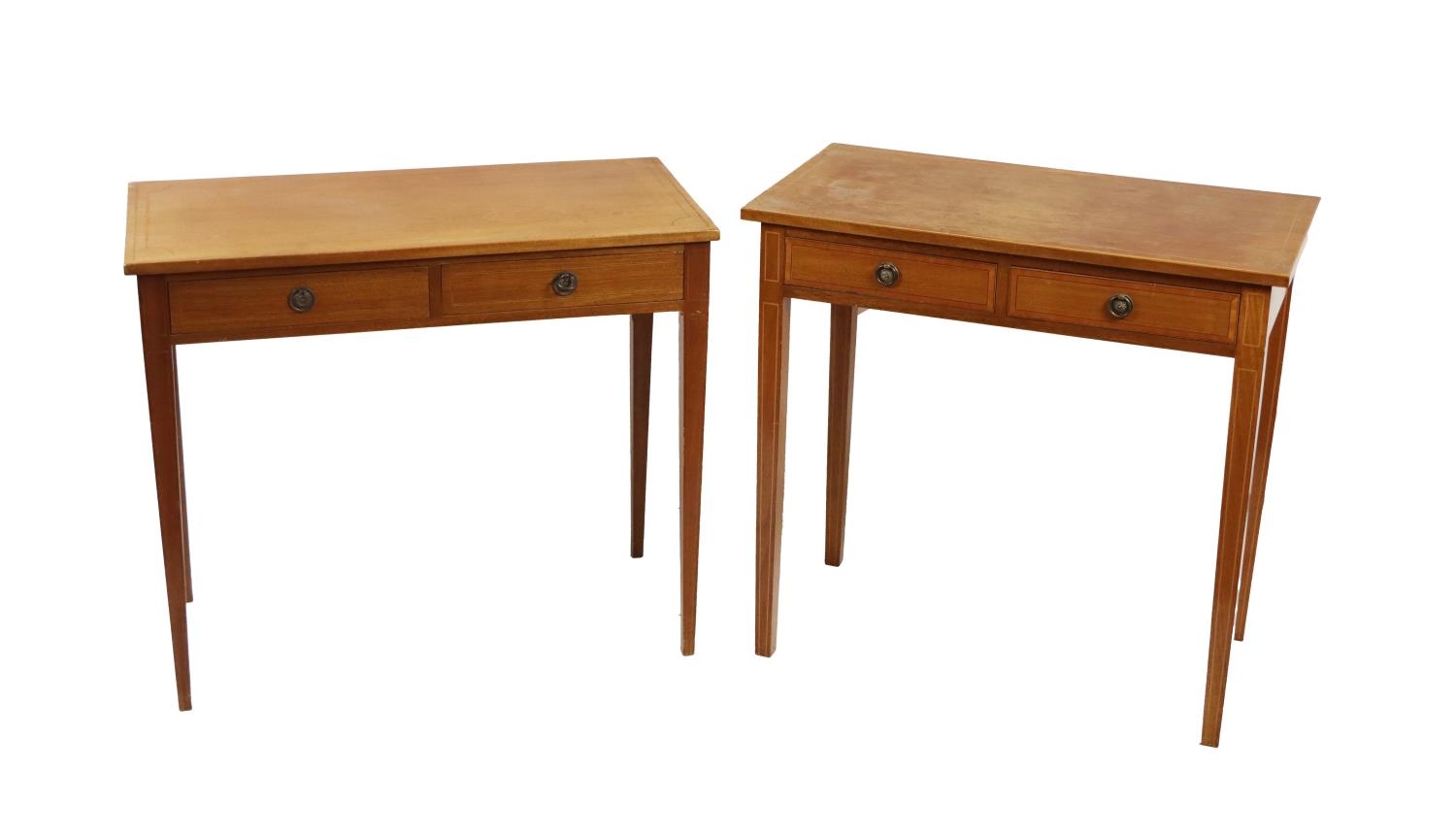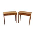 An almost matching pair of attractive Georgian style mahogany Side Tables, in the manner of Hicks, the inlaid top over conforming drawers on square tapering legs, approx. 81cms wide (32"). (2)
