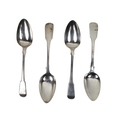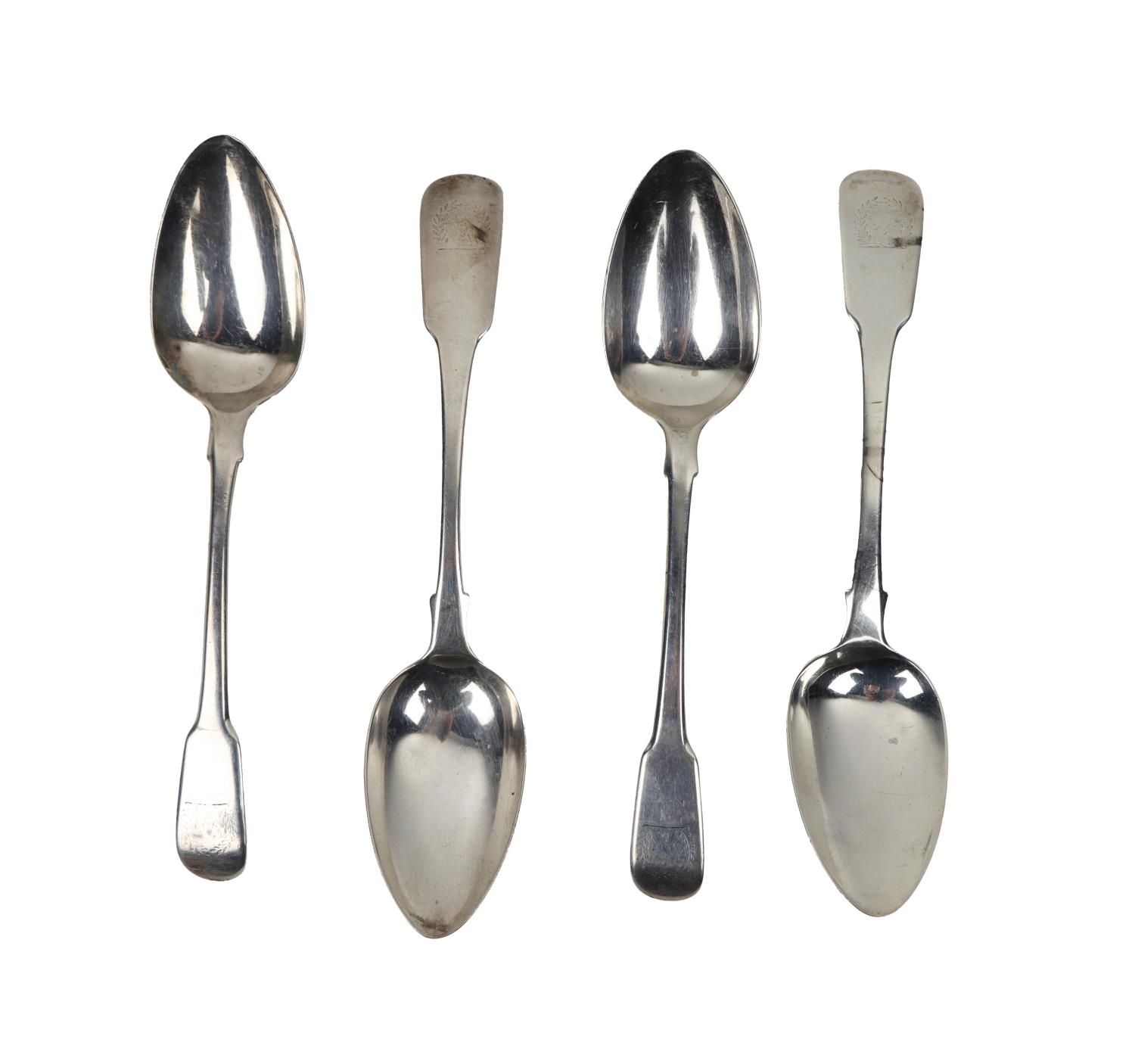 A pair of English silver Serving Spoons, by William Bateman, c. 1815; together with another similar pair c. 1820 with uniform crest, approx. 8 ounces. (4)