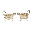 A pair of English George III antique silver Sauceboats, London 1759, by William Skeen, each with beaded edge 'S' scroll handle on shell and pad feet, approx. 11.5 ounces, hallmarked. (2)