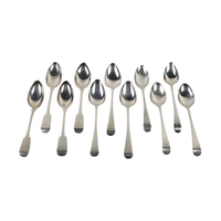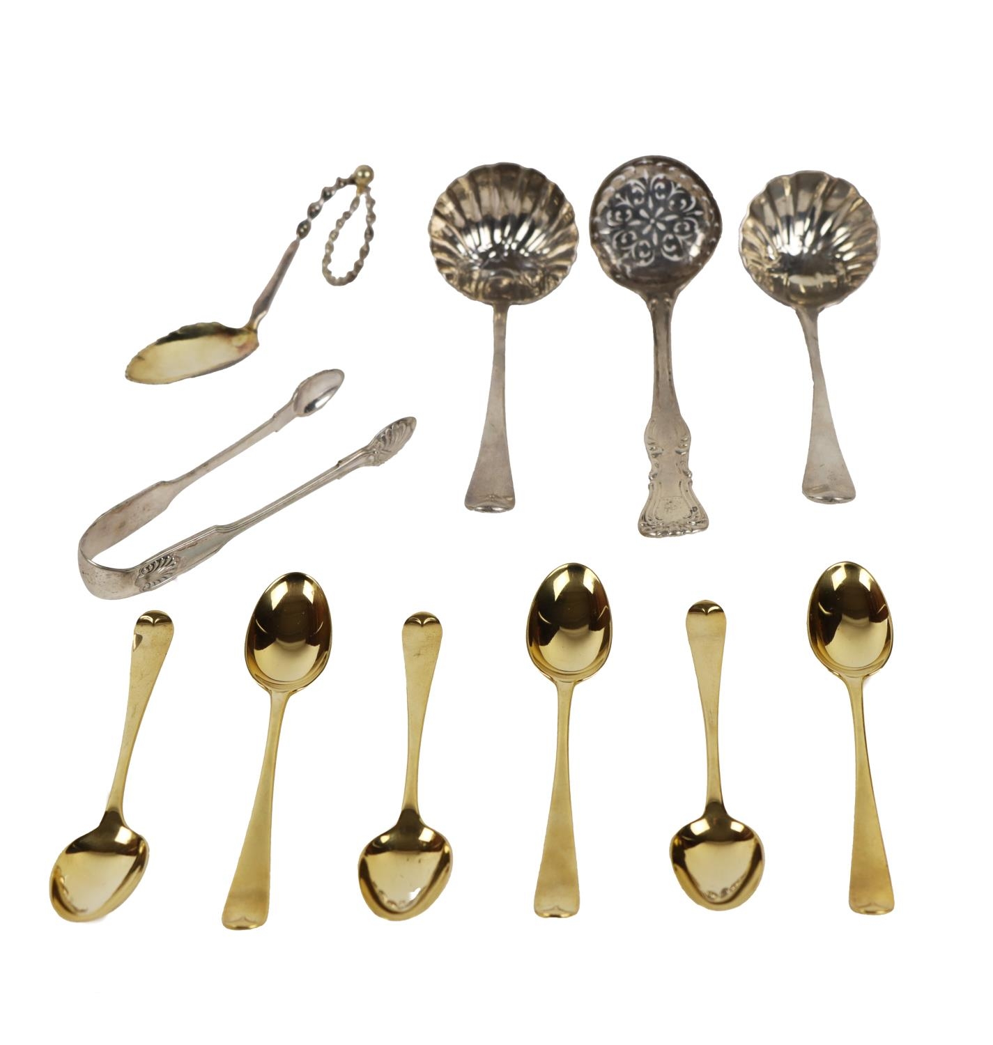 Silver: An English Victorian silver crested Kings pattern Sifter Spoon, by George William Adams; a pair of crested shell bowl design Ladles (marks worn); an English silver Kings pattern Sugar Tongs; a set of 6 silver gilt Teaspoons by John, Henry & Charles Lias?, London, and one other unusual, Continental silver Spoon with rope twist handles, as a lot. (1)