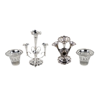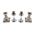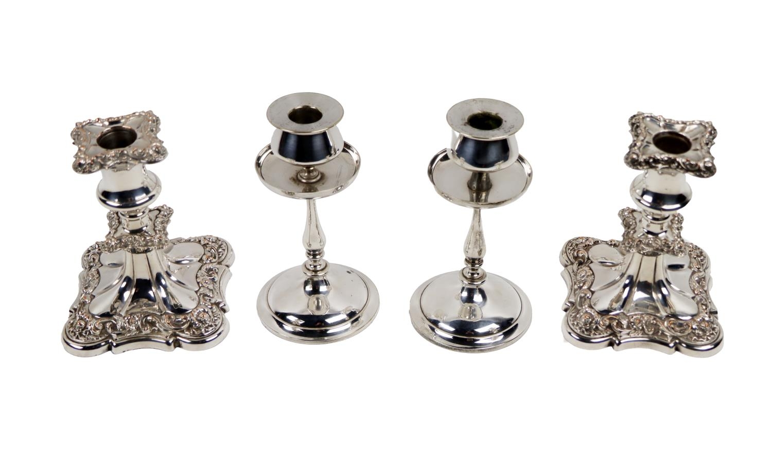 Silverware: A pair of attractive Victorian silver plated Bachelor Candlesticks, of floral pattern with removable sconces, each approx. 15cms (6") high; together with another pair of plated Candlesticks of modern design, each approx. 17.5cms (7"). (4)