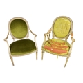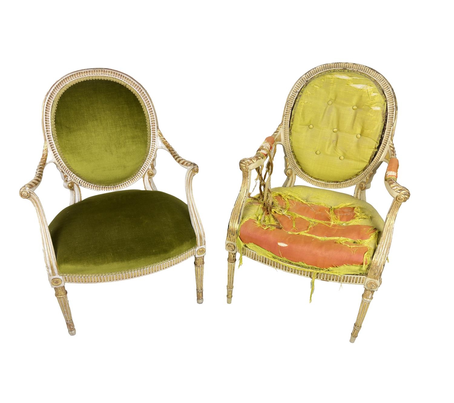 A near pair of important 18th Century painted and gilt Fauteuils, attributed to George Wyatt (1746-1813), each with upholstered shield backs, scroll arms above upholstered seats (one distressed) and bowed fronts on reeded tapering front and back legs. (2)