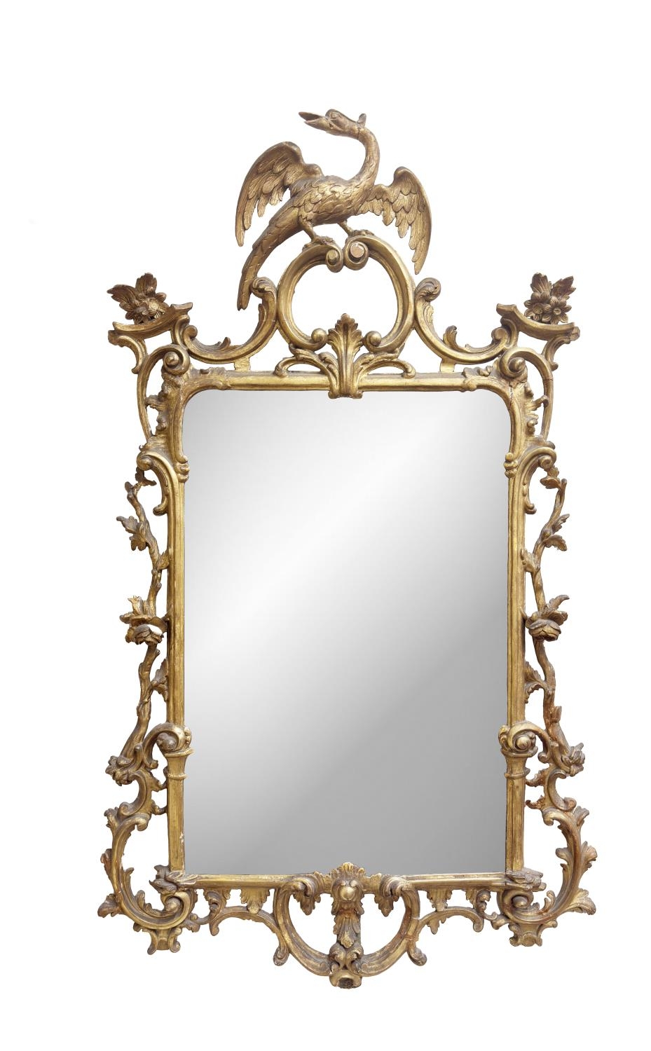 A fine quality Georgian period carved giltwood upright Mirror, in the manner of Thomas Chippendale, the frame surmounted with central Ho Ho bird on C scroll cartouche flanked either side with floral motifs, the sides with leaf and branch scrolled decoration on conforming base, approx. 140cms high x 81cms wide (55" x 32"). (1)