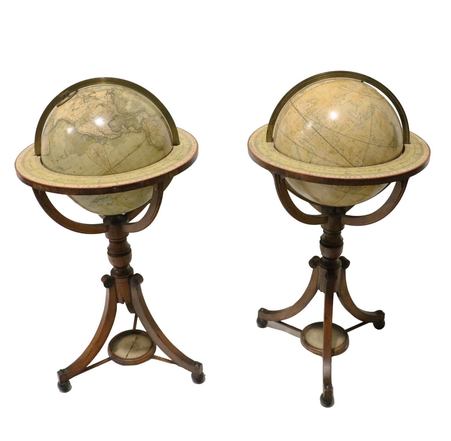 A highly important and rare pair of large early 19th Century Terrestrial and Celestial Globes on Stands, by John and William Newton, London 1818, each with shaped circular brass support bars, printed borders and spherical well, turned pillar support on three outsplayed legs, united by a stretcher with central stretcher, on ebonised ball feet, each approx. 102cms (40") high. (2)