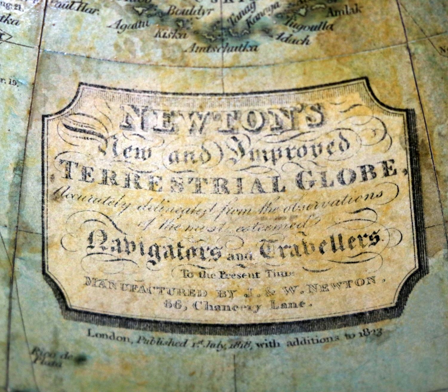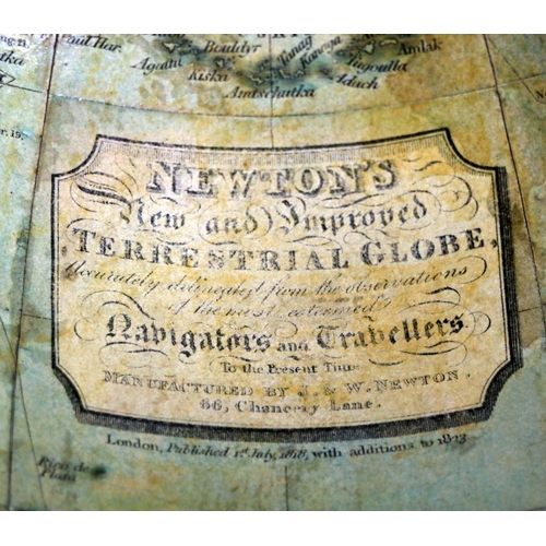 Note: Newton was one of the most important names in English Globe manufacturing during the first half of the 19th century. The business was established by John Newton (1759-1844) in around 1783. He published the first globe in partnership with map engraver William Palmer which was a pocket globe of 2in. diameter, re-issued from Nathaniel Hill's copper plates of 1754.