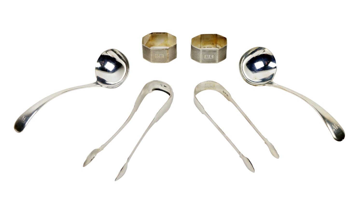 Silverware: An Irish Georgian silver Sugar Tongs, Dublin, Richard Archbold, c. 1810's; another English silver Sugar Tongs, William Bateman, London c. 1830's; a pair of English silver Ladles (monogrammed), London 1874, Atkins Brothers; a pair of chased design silver Napkin Rings, Birmingham by Deakin and Francis Ltd., 1937, as a lot (approx. 8 ounces). (6)