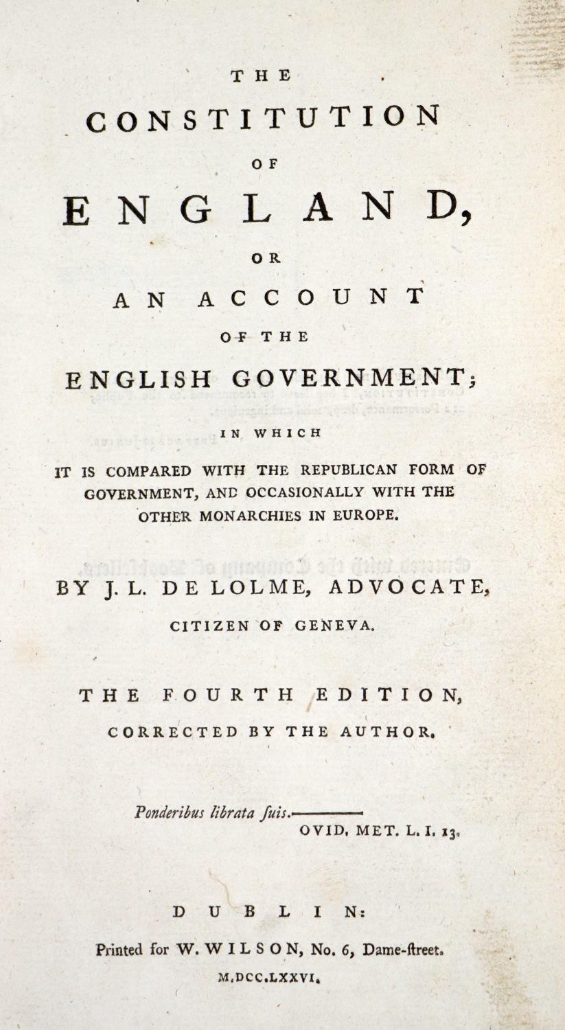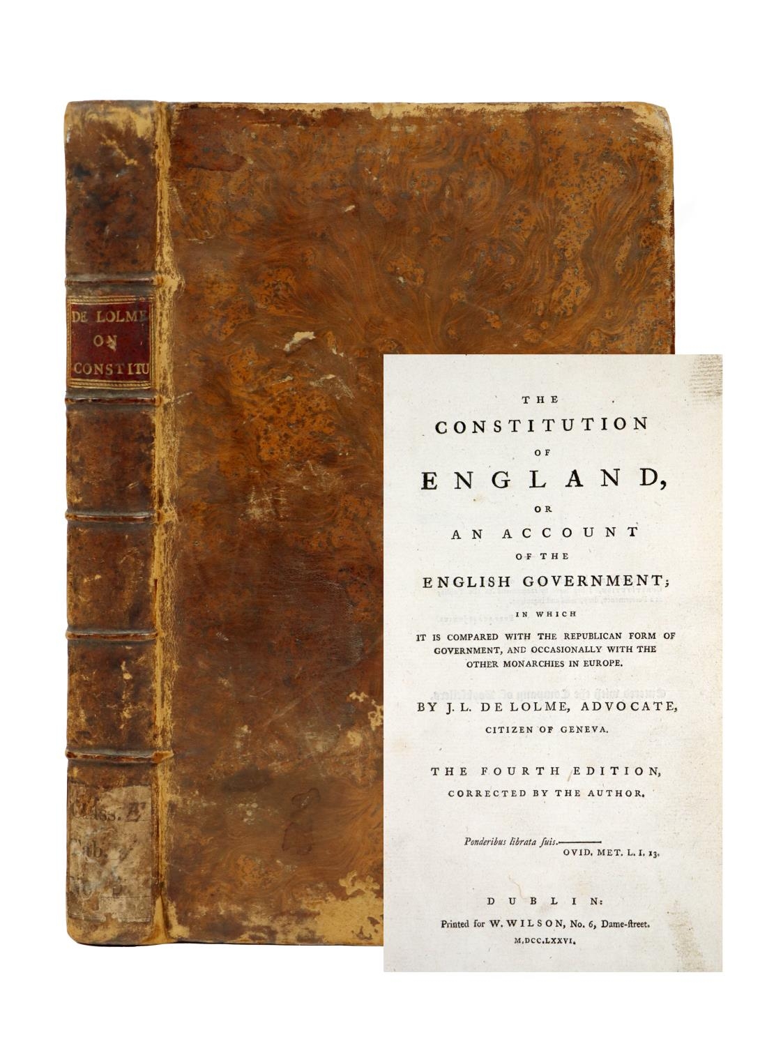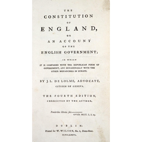 De Lolme (J.L.) The Constitution of England, or An Account of the English Government, 8vo D. 1776. Fourth Edn., hf. title, cont. tree calf, raised bands mor. label. Good copy. (1)