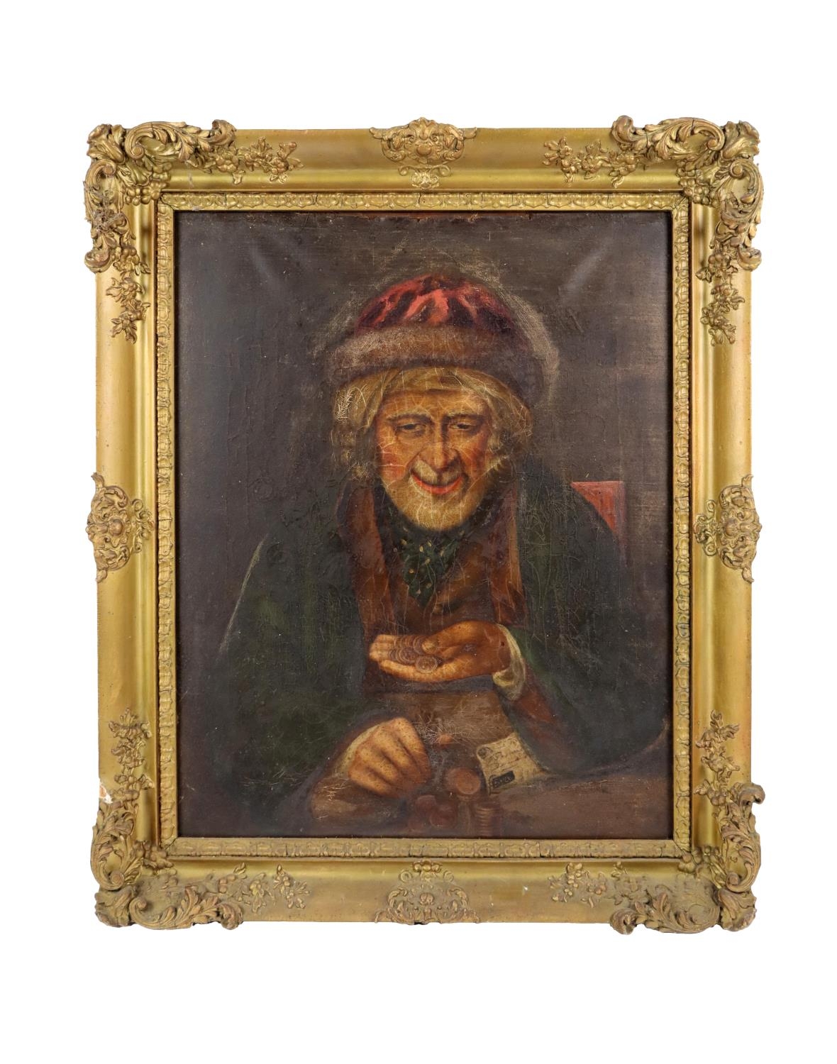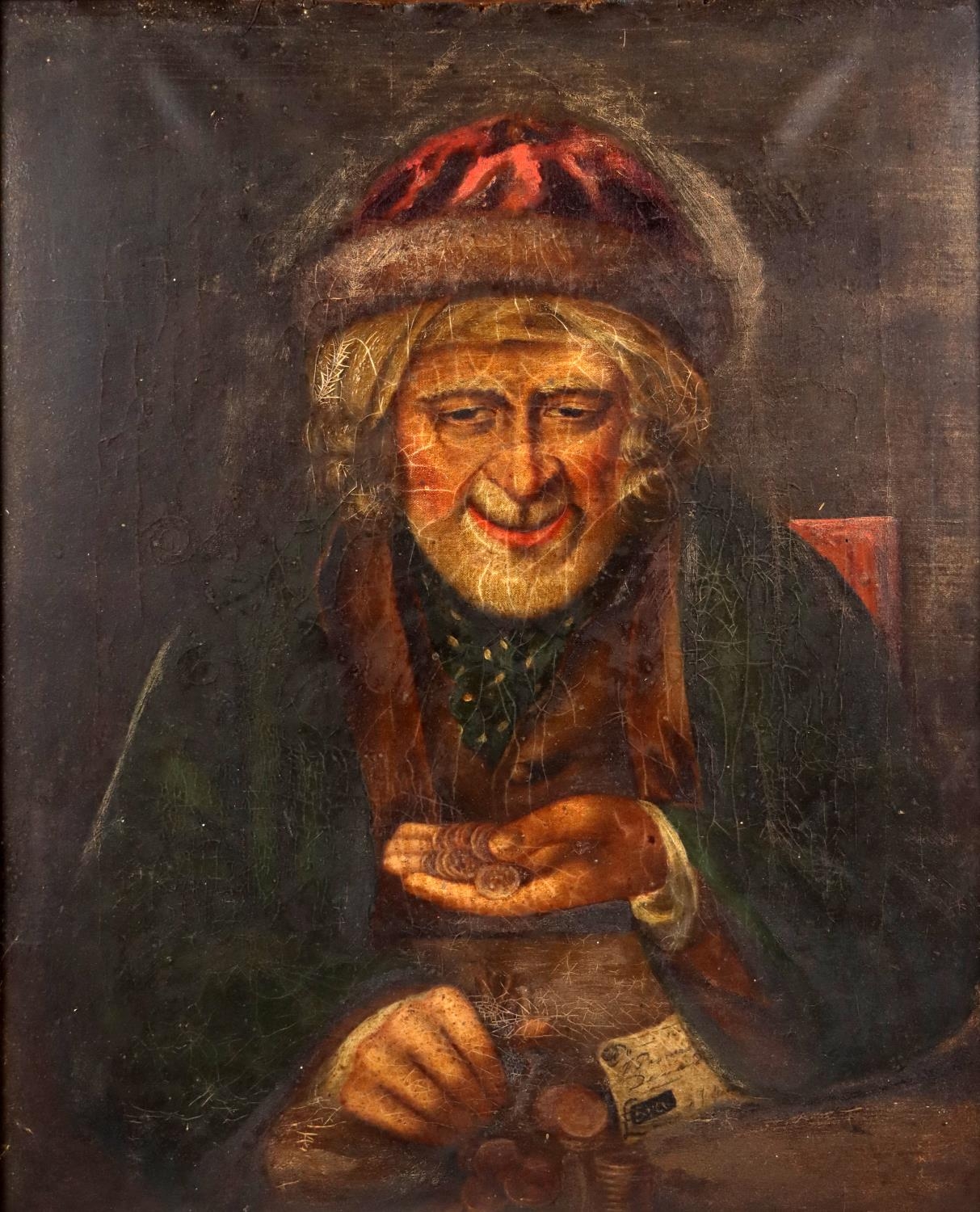 "The Miser, Counting his Money," O.O.C., 61cms x 51cms (24" x 20") in gilt frame. (1)