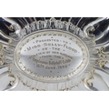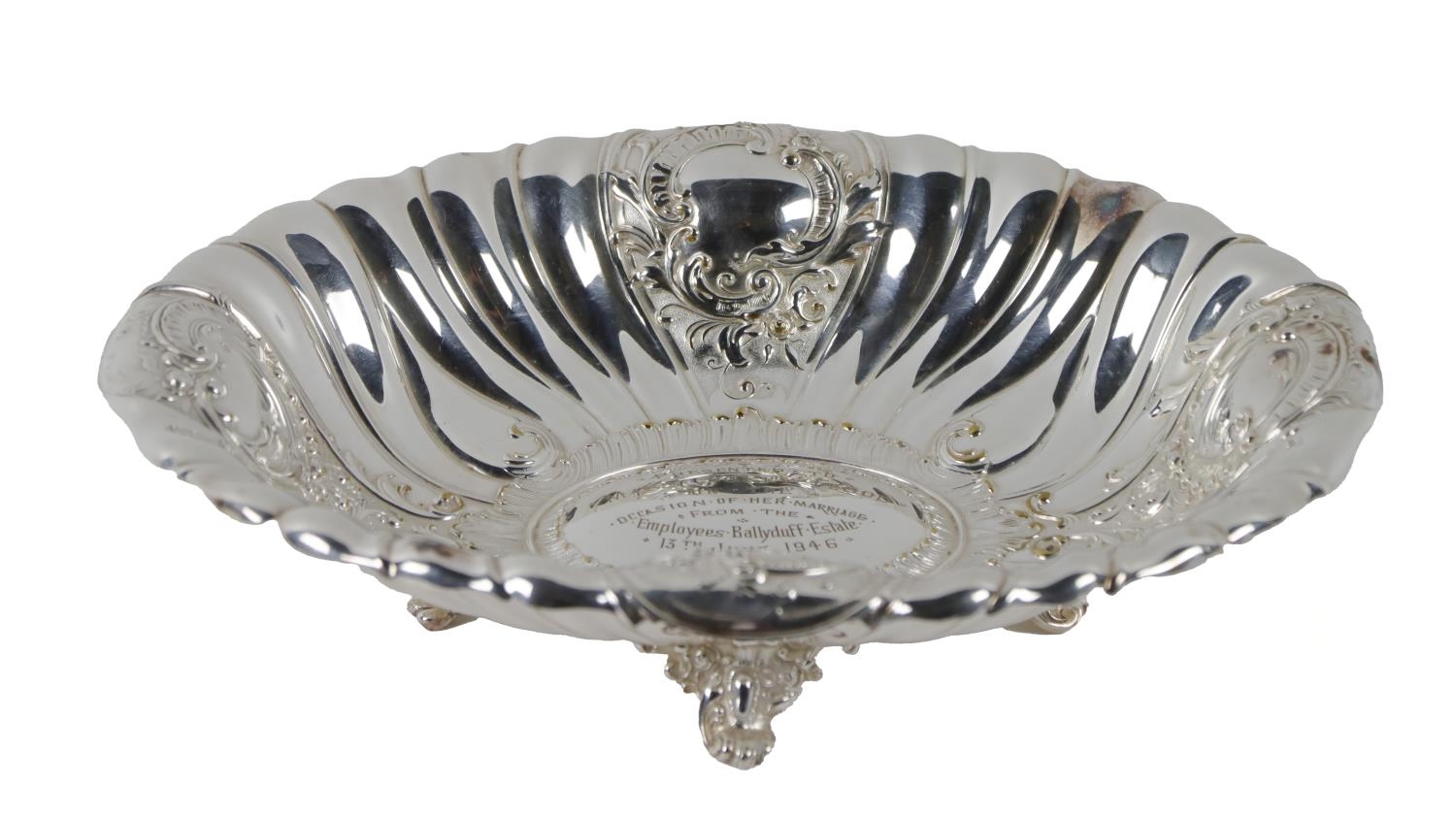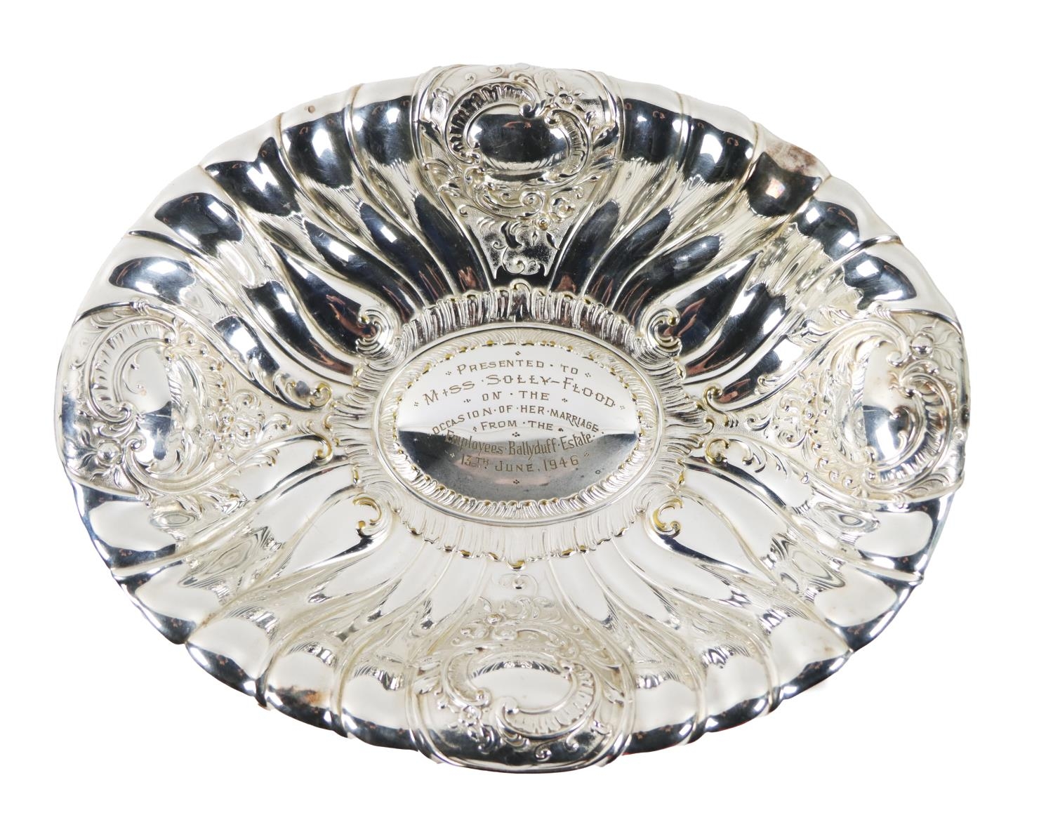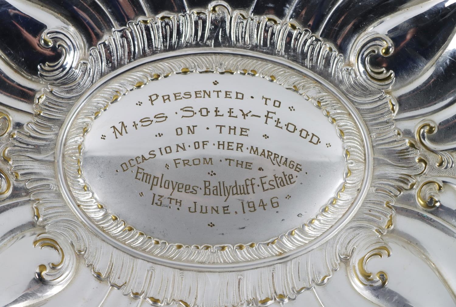 Co. Kilkenny: A large silver plated oval Dish, with 'C' scroll repoussé design, the center section engraved 'Presented to Miss Solly Flood on the occasion of her marriage, from the Employees, Ballyduff Estate, 13th June 1946,' on scroll feet. (1)
