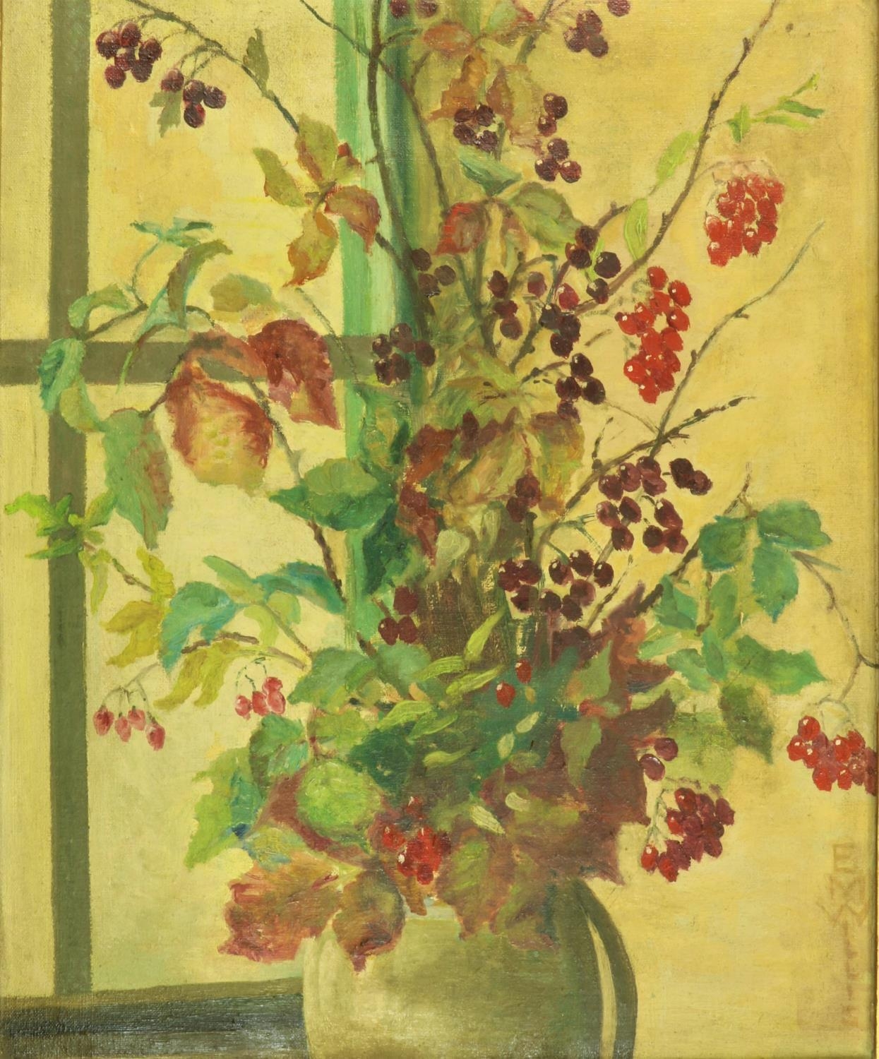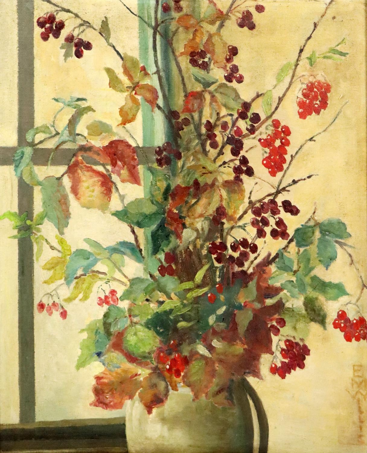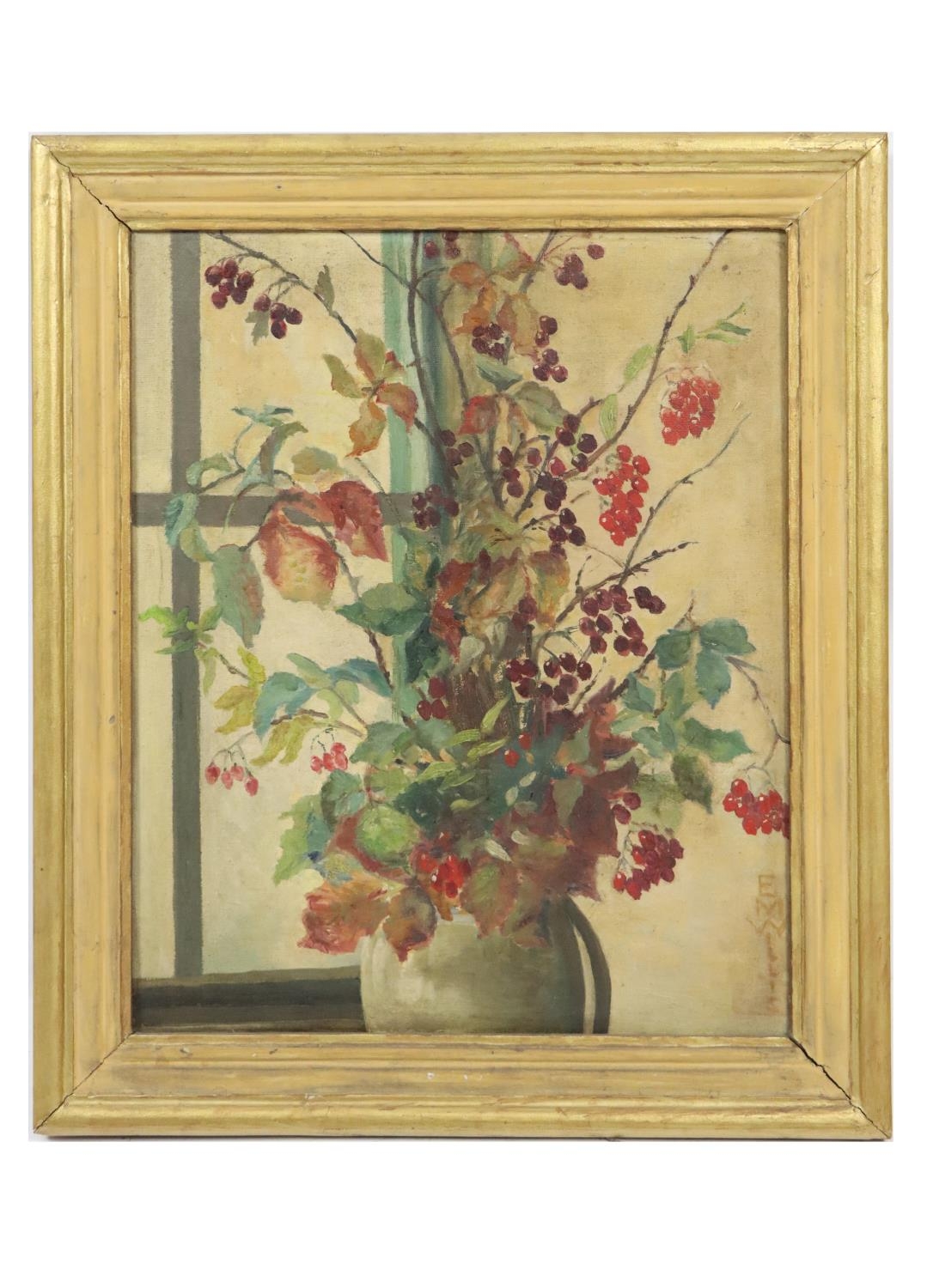 "November" - Still Life with flowers, berries etc., O.O.C., 41cms x 51cm (16" x 20"), Signed and inscribed on label on reverse 'R.A.F. Scheme', gilt frame. (1)