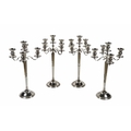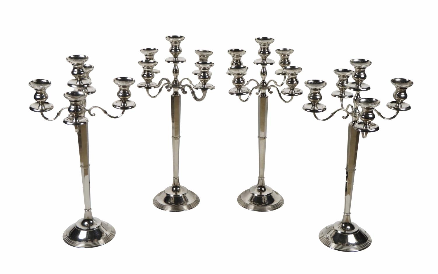 A set of four - five branch silver plated tall Candelabra, on hexagonal reeded column with circular base, approx. 79cms (31") high. (4)