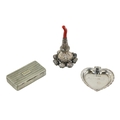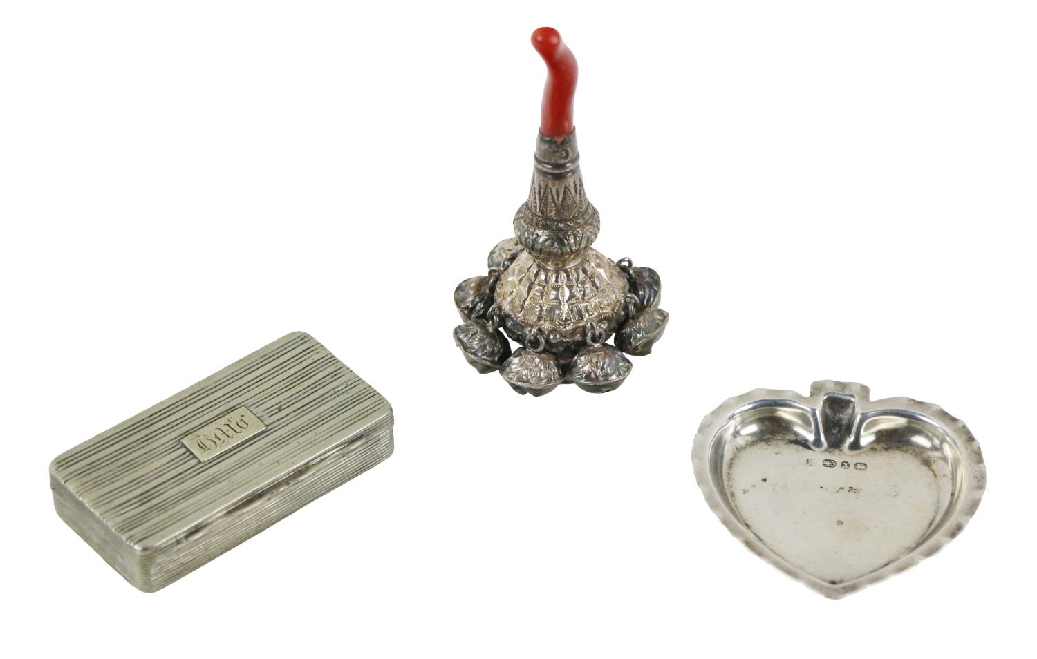 A Georgian silver Child's Rattle, fitted with rim of bells and red coral teether; also a small silver spade shaped Tray; and an attractive chased rectangular silver Pill Box with engraved initials 'H.M.C.,' as a lot. (3)