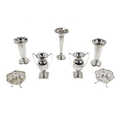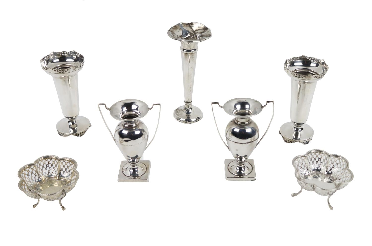 Silverware: A pair of pierced decorated and shaped silver Dishes, each on cabriole legs, Birmingham, by Synyer & Beddoes, 1919; a pair of English silver small tubular Vases (Weighted) with pierced top and base, approx. 15cms (6") high, Birmingham 1937; another similar Vase, Birmingham, William Devenport 1923; a pair of vase shaped two handled silver Urns on square bases, Birmingham 1905 by A. & J Zimmerman, as a lot. (7)