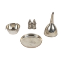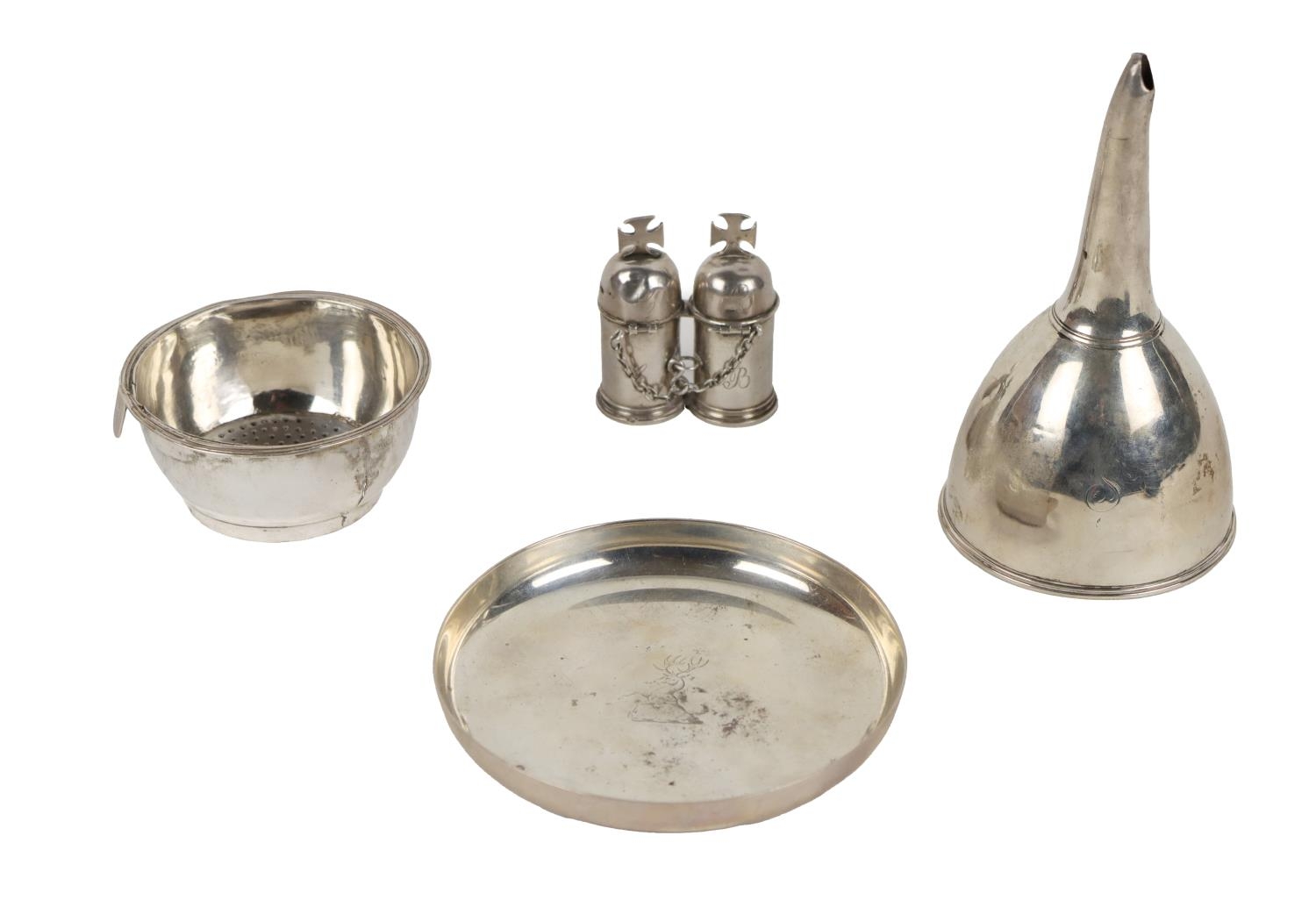 Silver: A Georgian period silver Wine Funnel, with monogram 'S', London c. 1809; a heavy crested silver small Tray, London (Goldsmith & Silversmith Co. Ltd., 1948; also an early English silver dual 'Holy Oils,' portable with cruciform hinged lids, each with initials 'C' & 'B', hallmarked on base, as a lot. (3)