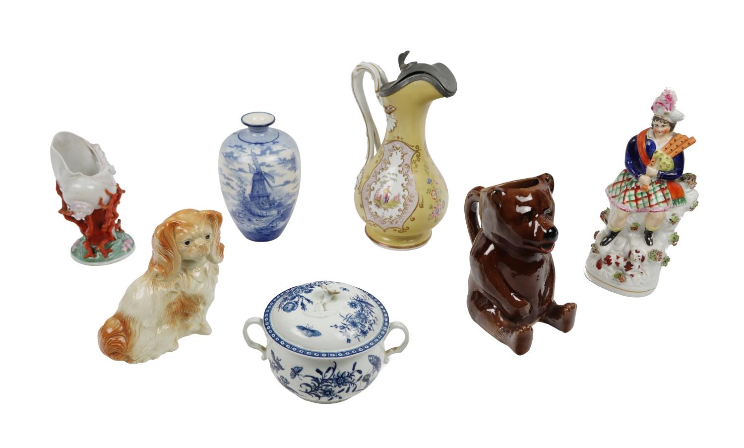 An attractive yellow ground English porcelain Water Jug, by Jas. Dixon & Sons, Sheffield, March 1842, with painted panels of Chinese figures, 29cms (11 1/2") high; a 19th Century Staffordshire Figure of a Scottish Piper; a blue and white Worcester Bowl, and lid (dam.) and 4 other items. (a lot)