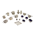 Silverware: Collection of late Georgian / Victorian / Edwardian Dinner Silverware, comprising salts, mustard pots, shakers, spoons etc., some with liners. As a collection, w.a.f. (1)