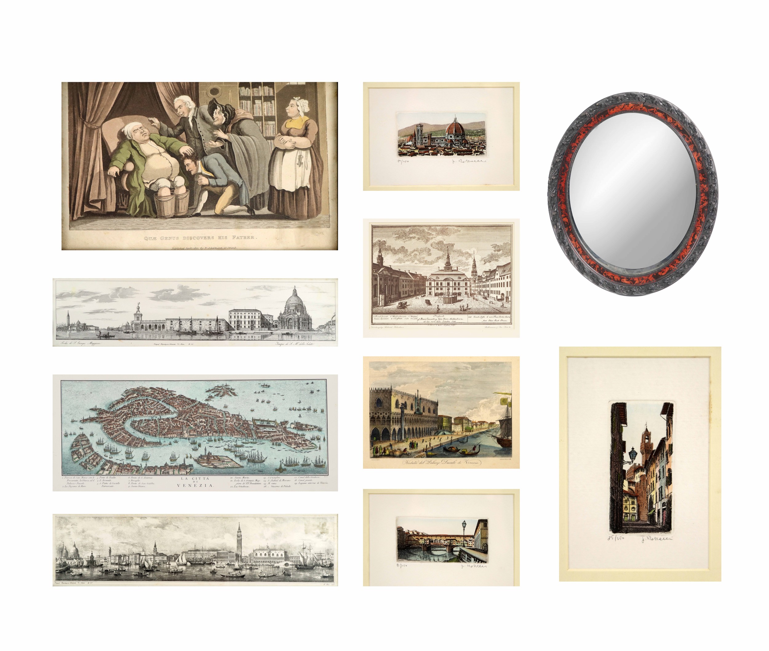 A large collection of varied modern framed Prints and Engravings, mostly coloured, various sizes; together with numerous other Prints and an oval Mirror. As a lot, w.a.f.