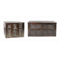 An 18th Century English oak Larder Cupboard, with Gothic style double carved paneled door with four conforming panels, each side with linen fold panels with an associated upper section with double doors, carved and relief depicting Tudor rose and typical Gothic panels with similar linen fold side panels, approx. 104cms wide x 150cms high (40" x 63"). (2)