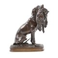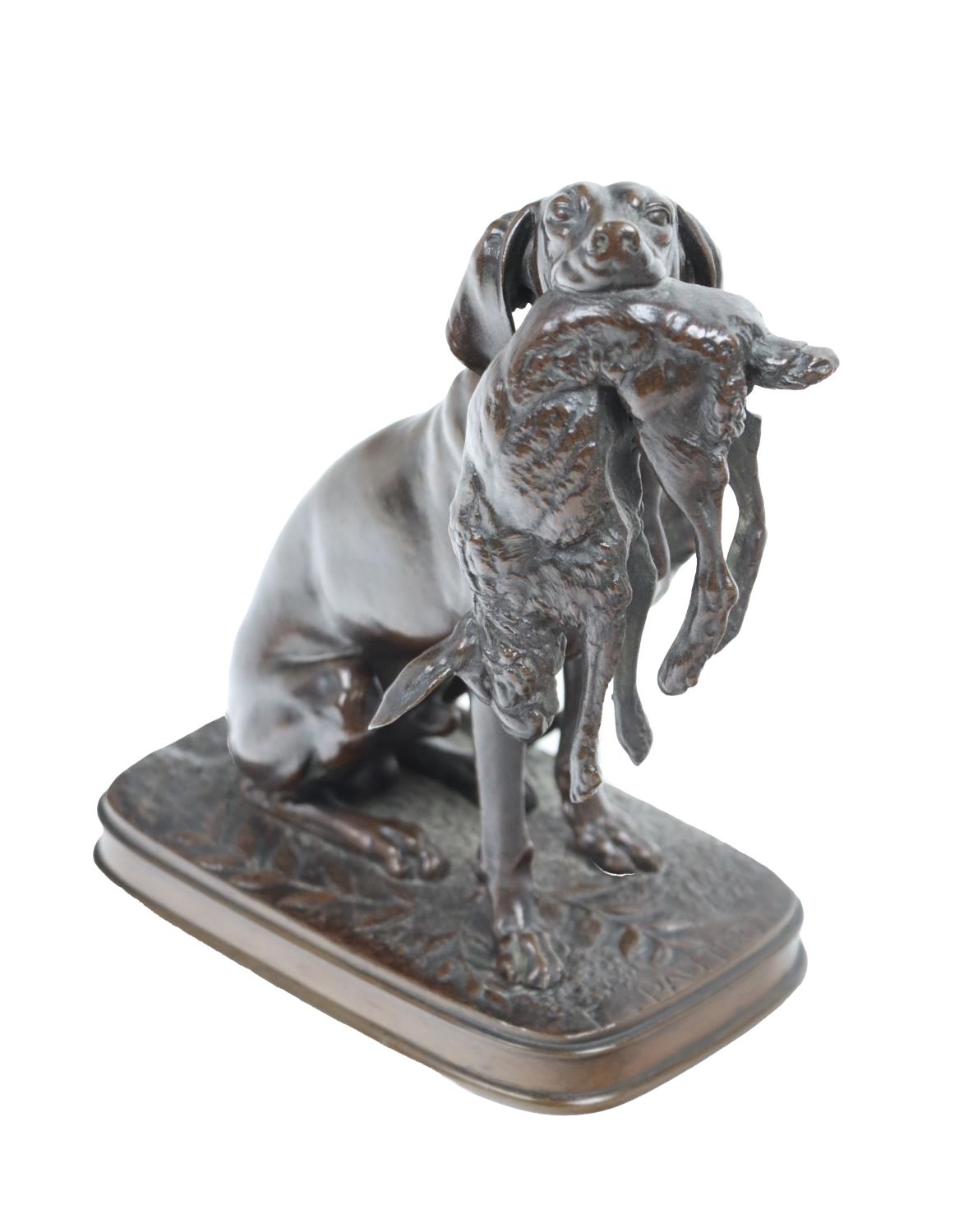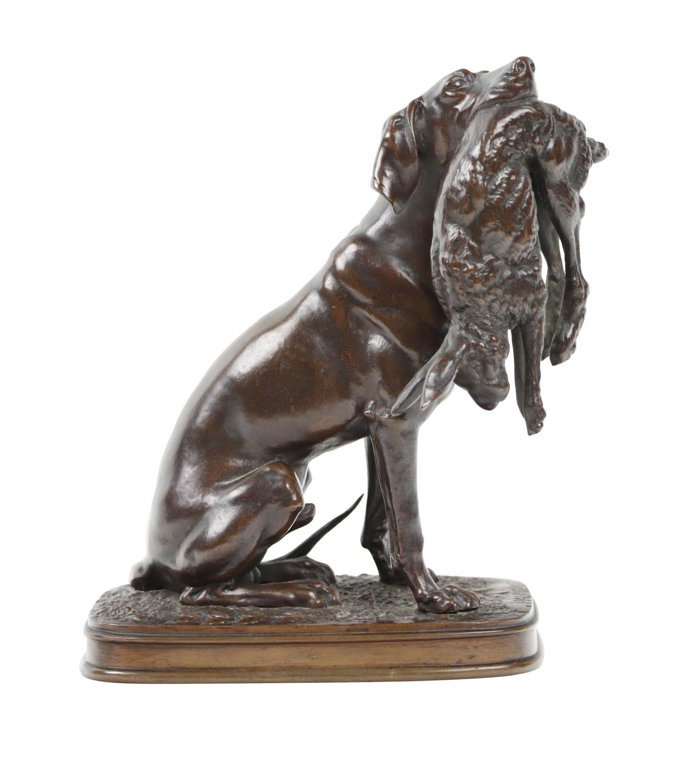 Fine bronze Study of a hunting dog holding a hare, "Braque with hare," bears signature, approx. 21cms (8 1/4") high. (1)
