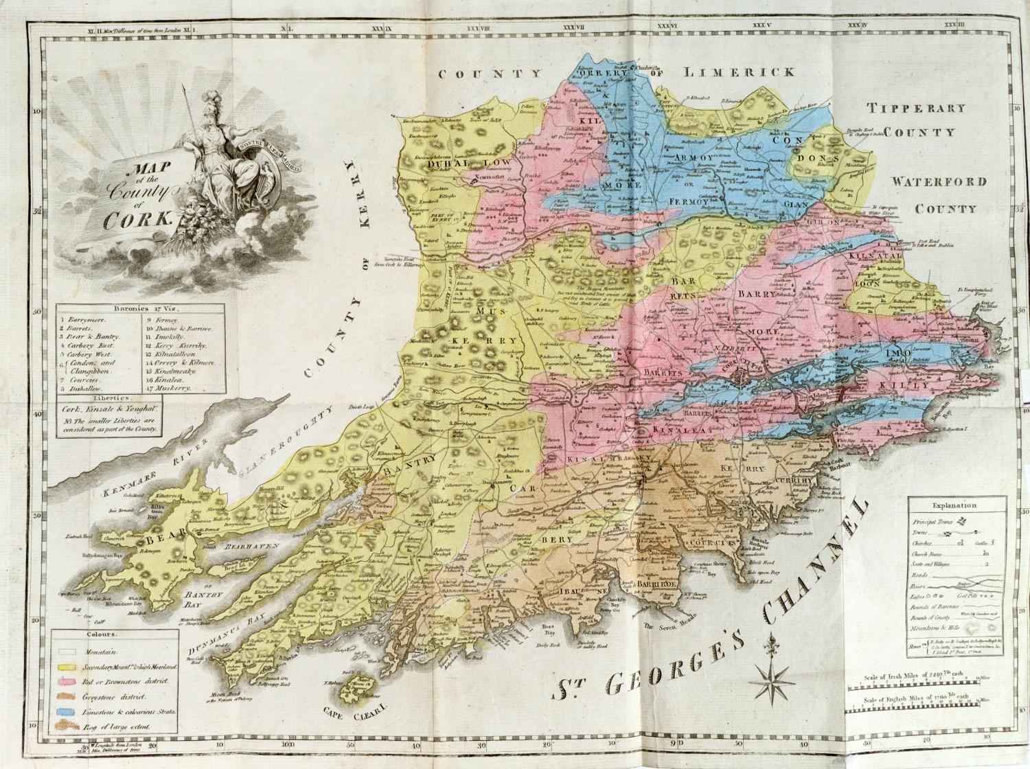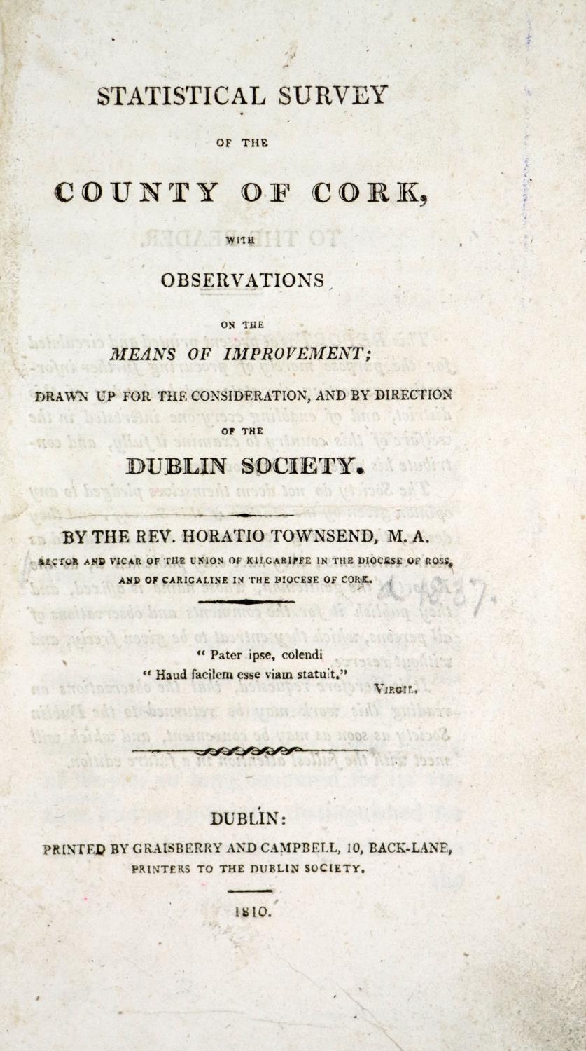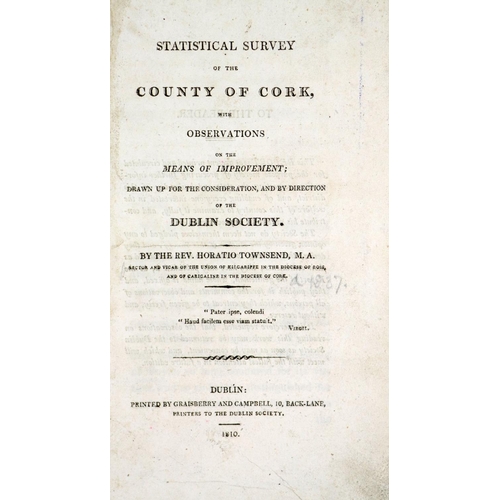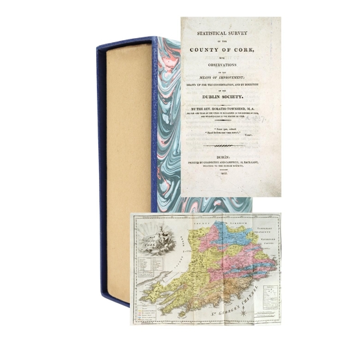 R.D.S.: - Townsend (Rev. Horatio) Statistical Survey of the County of Cork, with Observations... and by Direction of the Dublin Society. Thick 8vo Dublin 1810. First Edn., in custom made box. Lg. fold. cold. map, uncut, orig. boards, rebacked. V. good. (1)