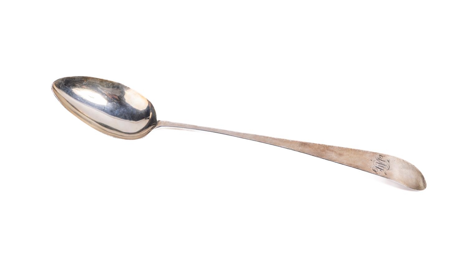 An Irish Georgian period silver Serving Spoon, of plain design, with monogram, by John Power, Dublin 1793, 32cms (12 1/2") approx. 2 ounces. (1)