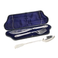A silver fiddle pattern Basting Spoon, London c. 1832, by William Chawner, approx. 6 ozs; together with Victorian plated Fish Servers, c. 1880, in the providence pattern with die stamped scroll and floral pattern on blade and tines, bearing the design registry mark and makers mark of Martin Hall & Co., in fitted case. (2)