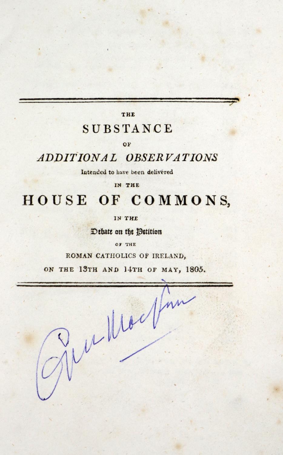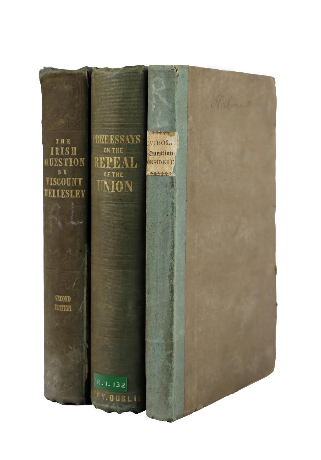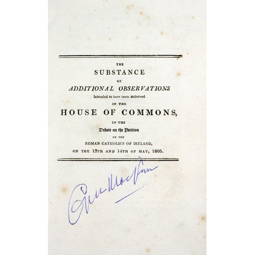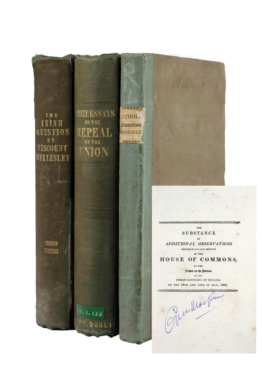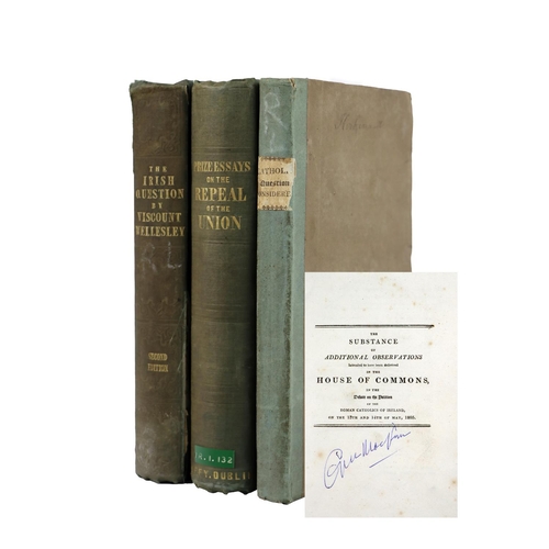 Hippisley (Sir J.C.) The Substance of Additional Observations .. in the House of Commons in the Debate of the Petition of the Roman Catholics of Ireland, on the 13th & 14th May 1805, 8vo Lond. 1806. First Edn., Hf. title, & errata at front, uncut orig. boards; Wellesley (Viscount) The Irish Question Considered in its Integrity, 8vo Lond. 1844. First Edn., orig. cloth. Two Scarce items. (2)