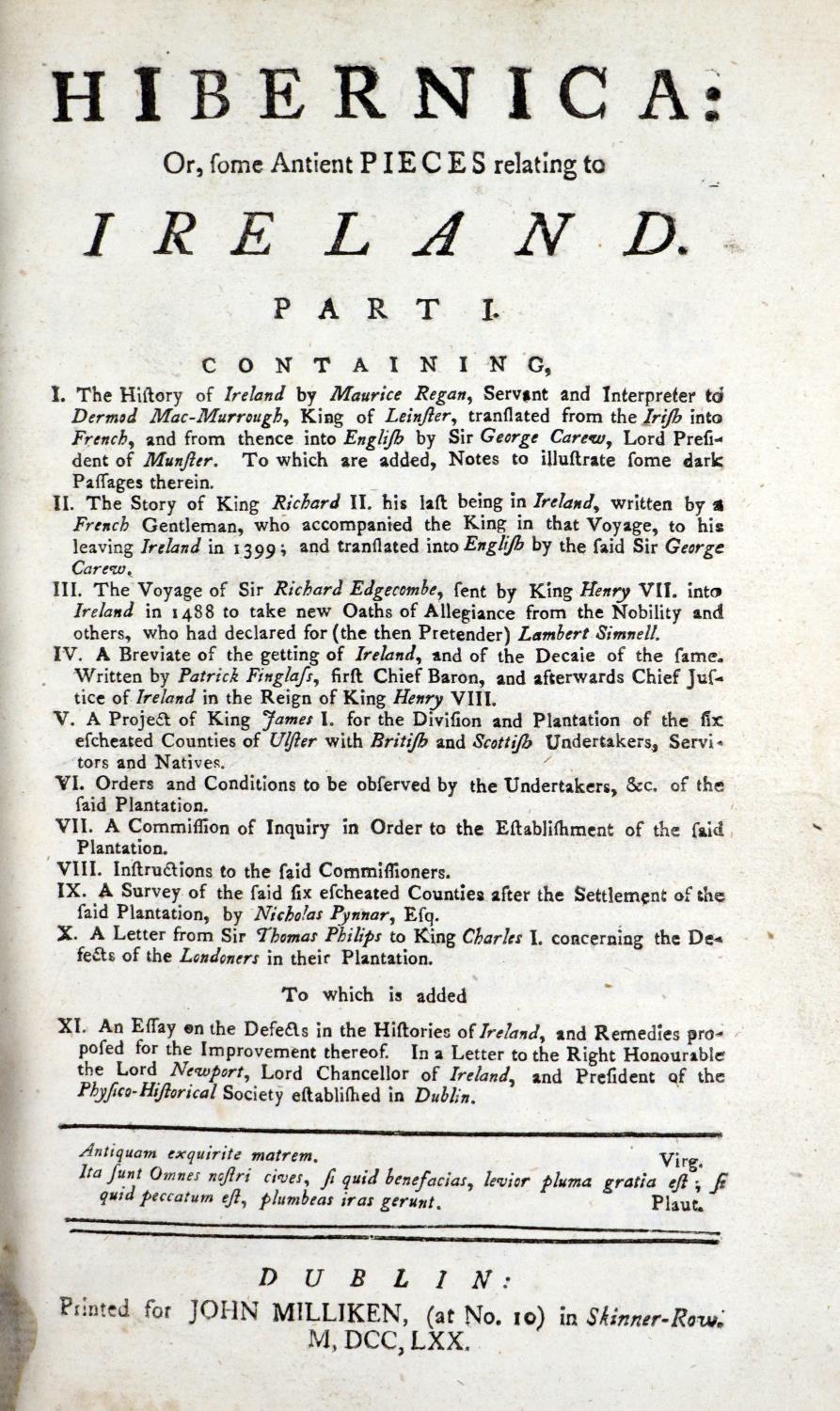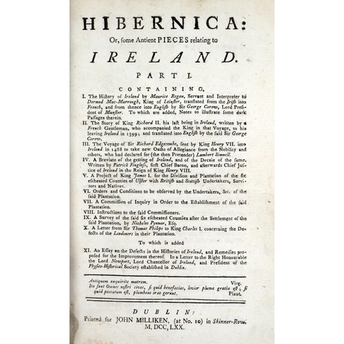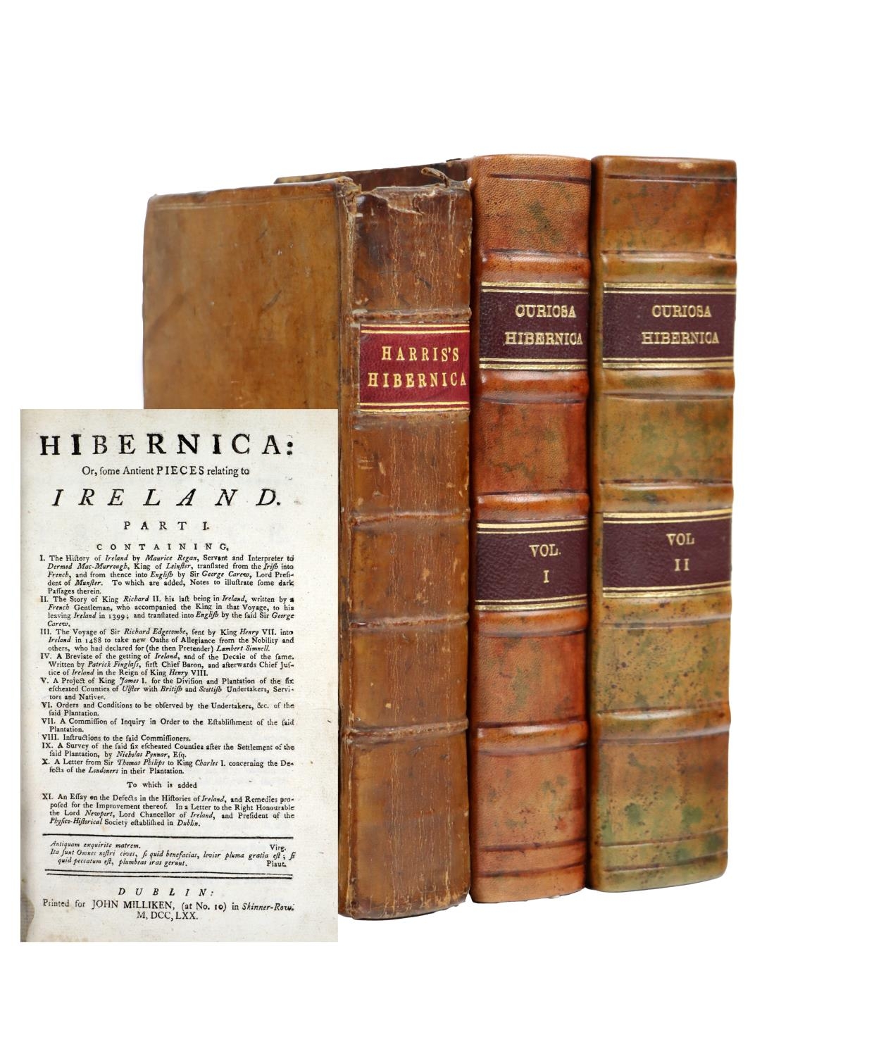 [Harris (Walter)] Hibernica: Or, some Ancient Pieces relating to Ireland, 2 Parts, 8vo Dublin 1770. Cont. full calf, mor. label; Desiderata Curiosa Hibernica: Or a Select Collection of State Papers, 2vols. 8vo Dublin 1772, cont. calf, rebacked, mor. labels. (3)