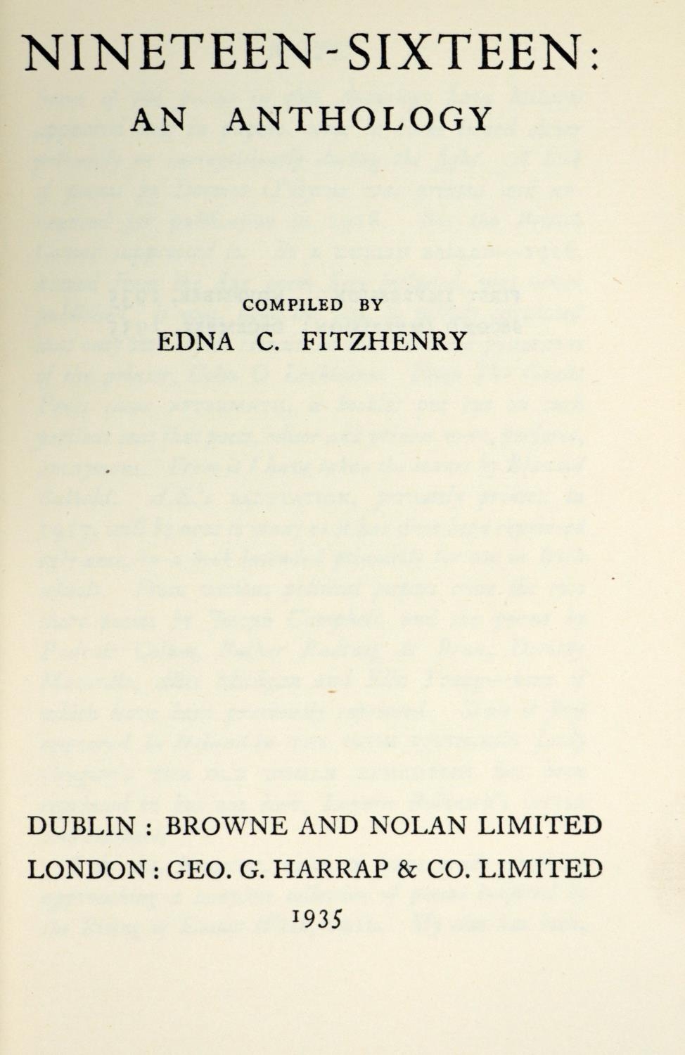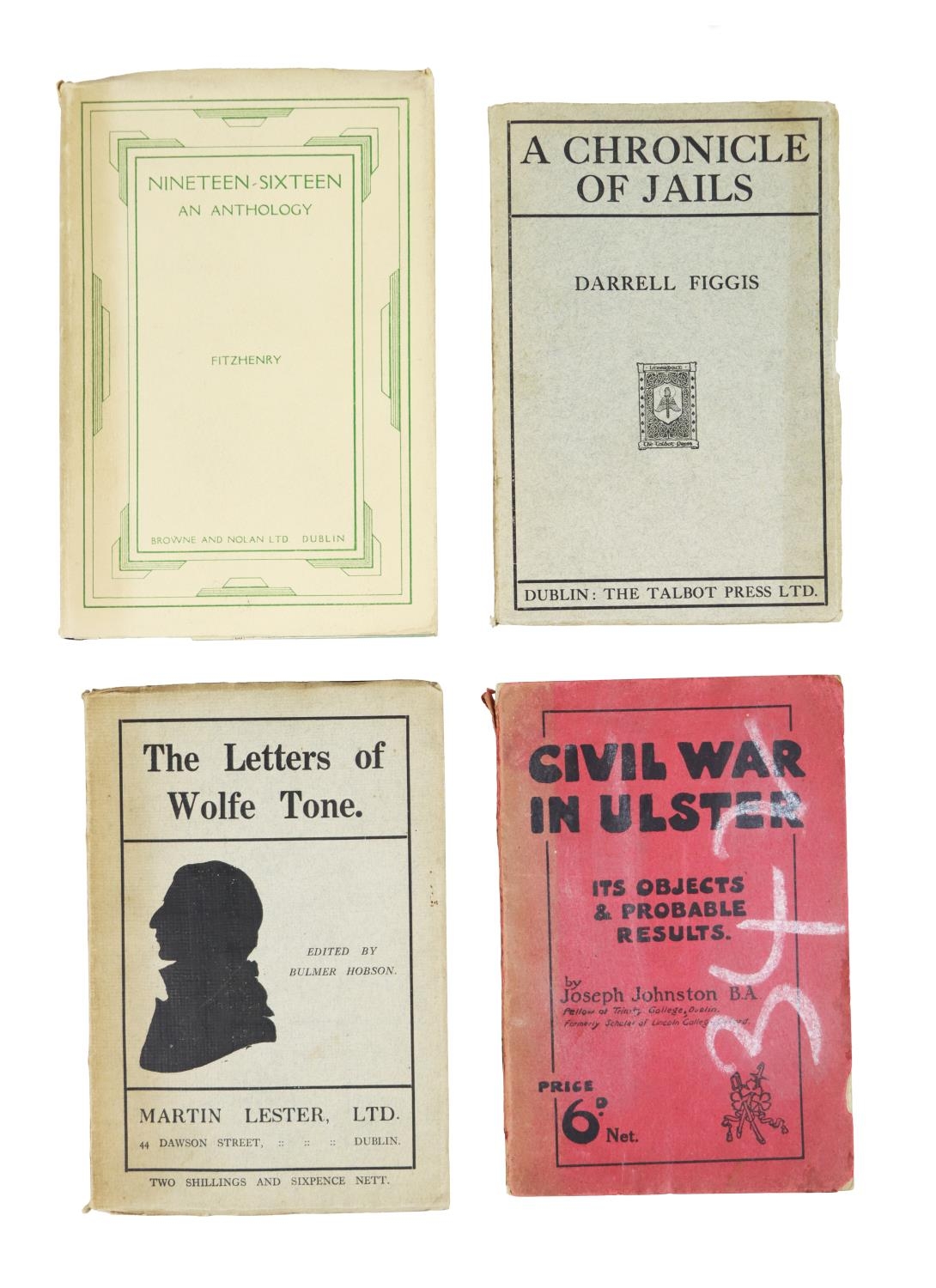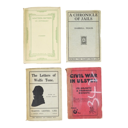 Fitzhenry (Edna C.) Nineteen - Sixteen: An Anthology, 8vo, D. 1935, cloth and d.j.; Hobson (B.)ed. The Letters of Wolfe Tone, 8vo D. (Lester Ltd.) n.d., ptd. wrappers; Figgis (Darrell) A Chronicle of Jails, 8vo D. (Talbot Press) 1917, First Edn., with tipped-in signature in Irish & English on dedit page, ptd. wrappers; Johnston (Joseph) Civil War in Ulster, Its Objects and Probable Results, 8vo D. (Sealy) c. 1914, ptd. wrappers, as a lot, w.a.f. (4)