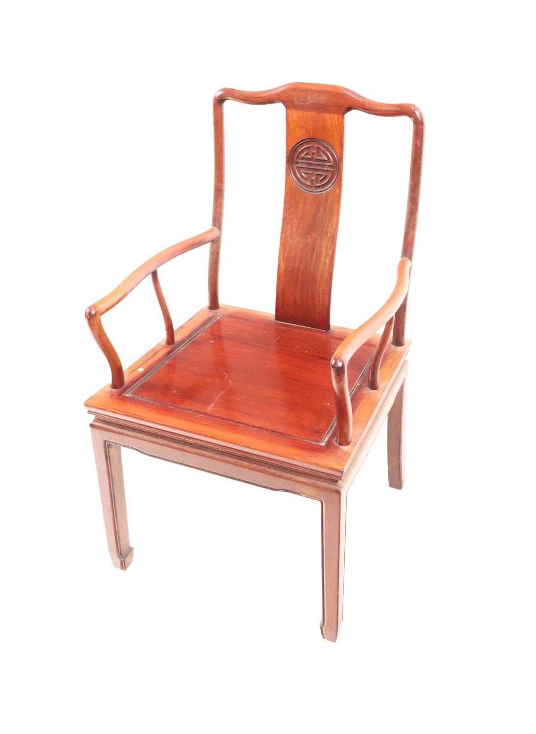 A heavy Chinese hardwood Carver Chair, of plain design with Chinese carved mask on splat back. (1)