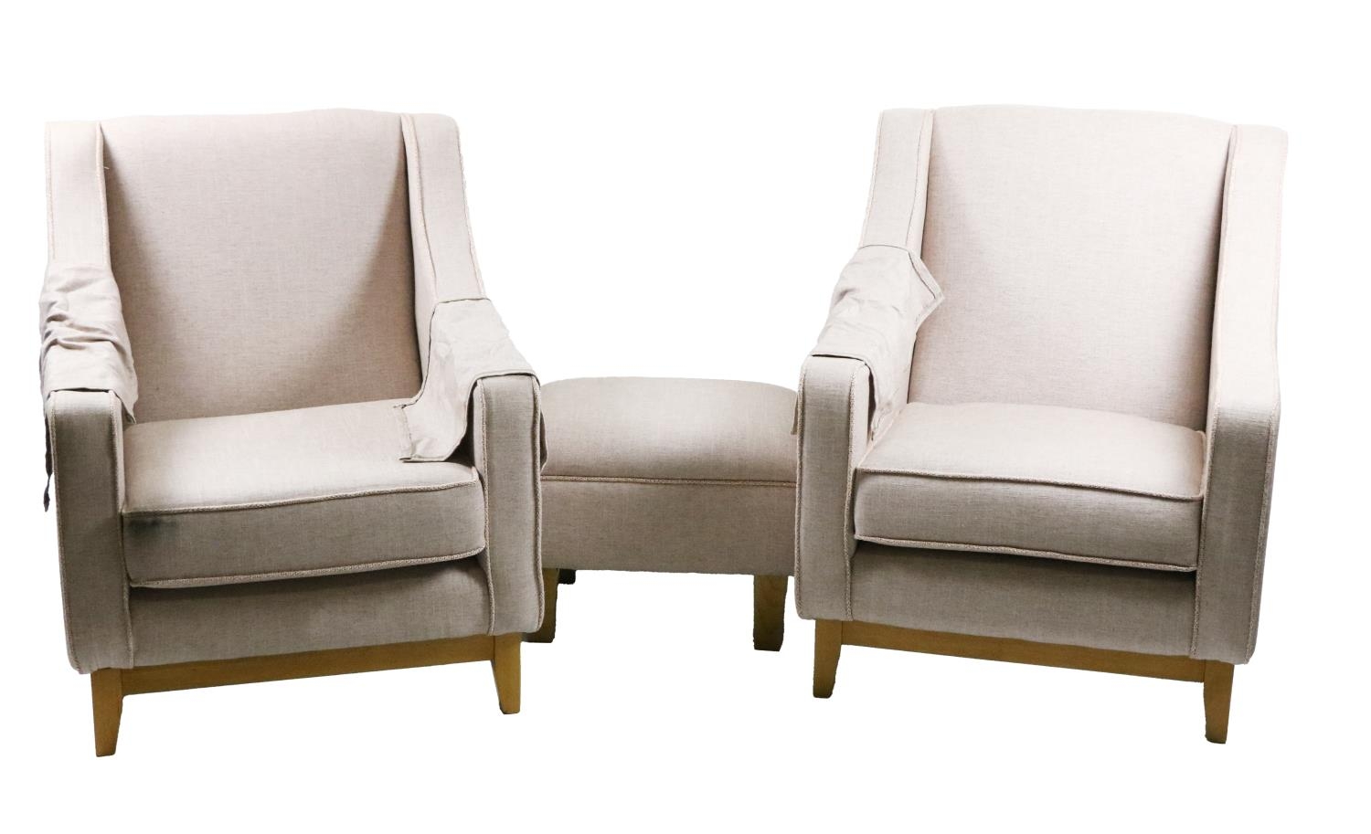 A pair of Parker Knoll type Armchairs, covered in cream sack cloth fabric with loose cushions on front square feet, with matching Footstool. (3)