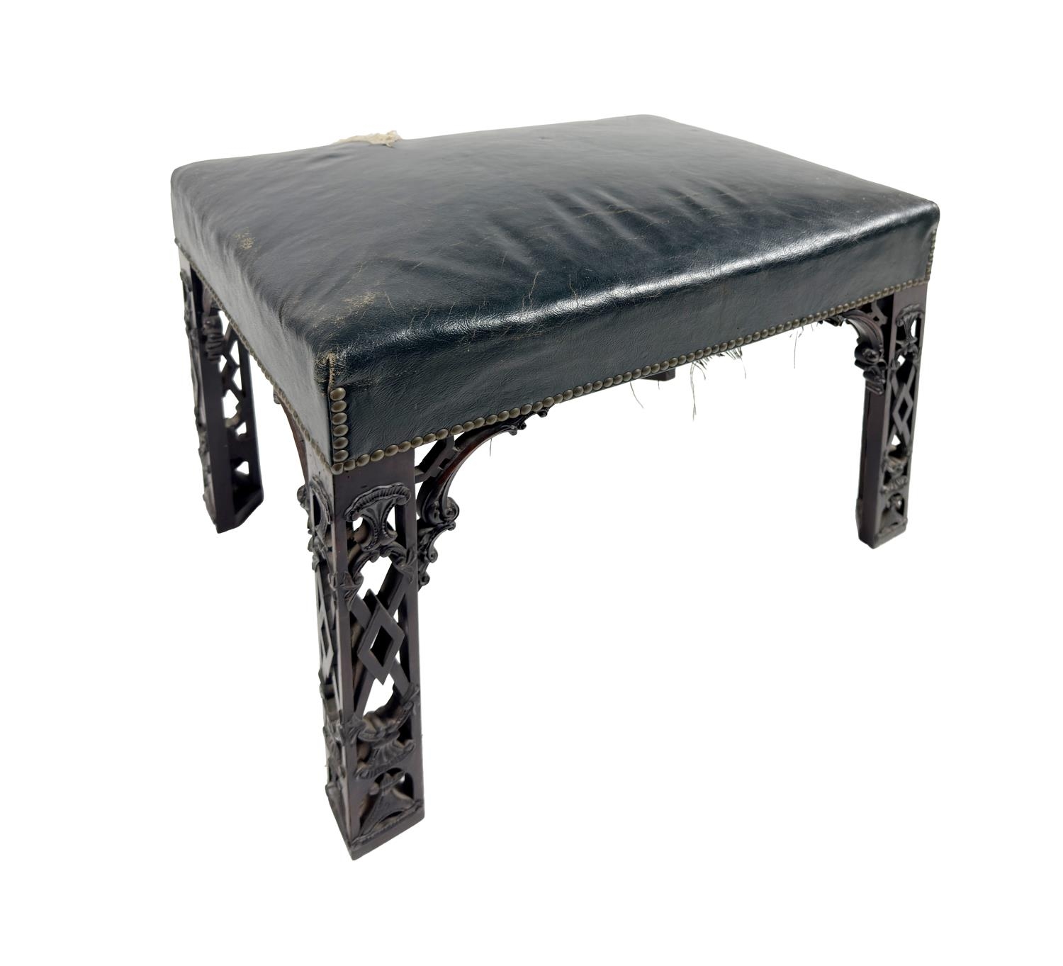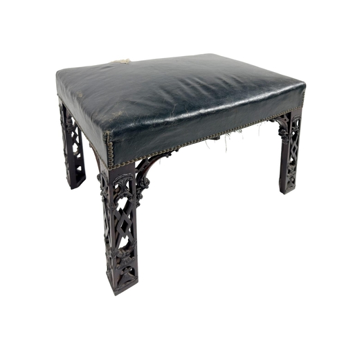 A 19th Century Irish mahogany Footstool, in the manner of Thomas Chippendale, the seat covered in green hide with brass studding on four angled carved fret work les, 61cms wide x 45cms high (24" x 18"). (1)