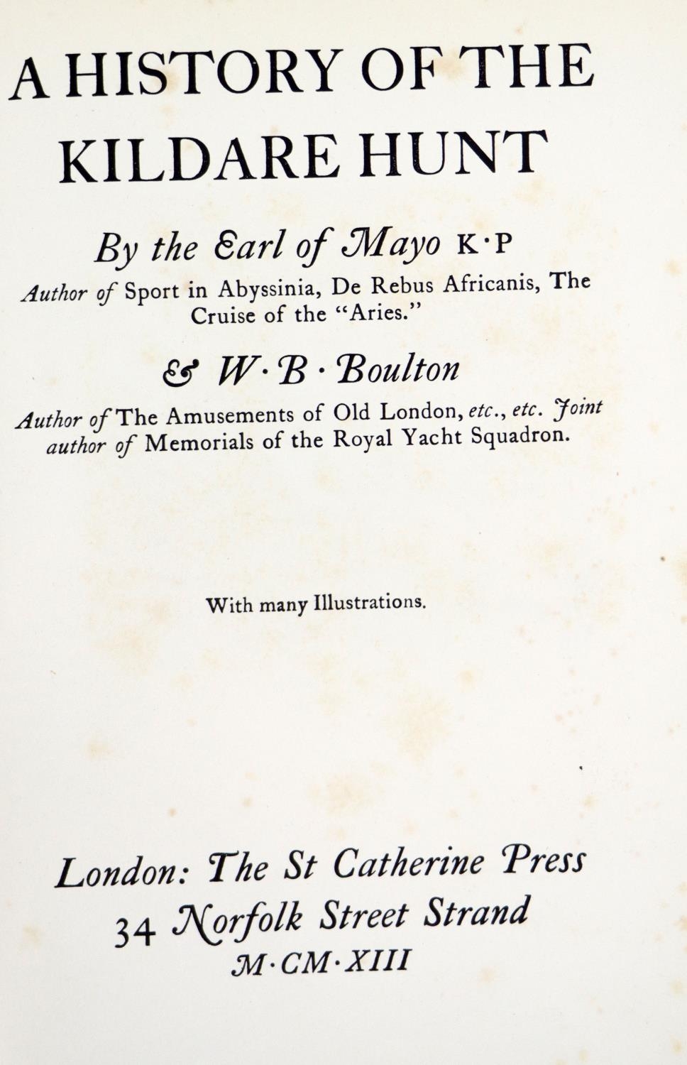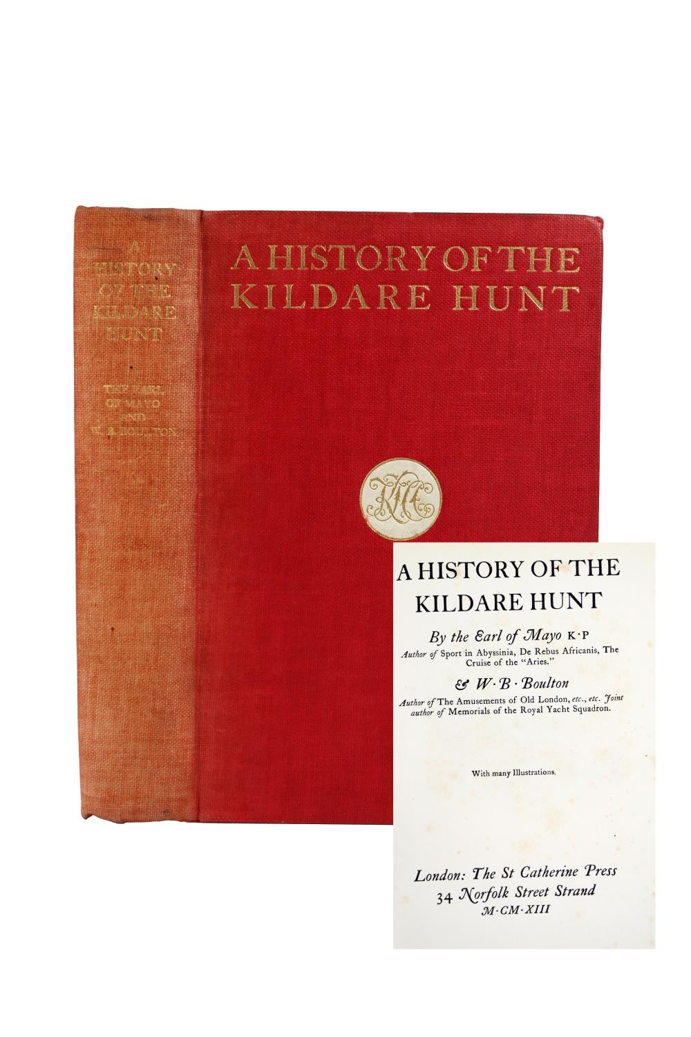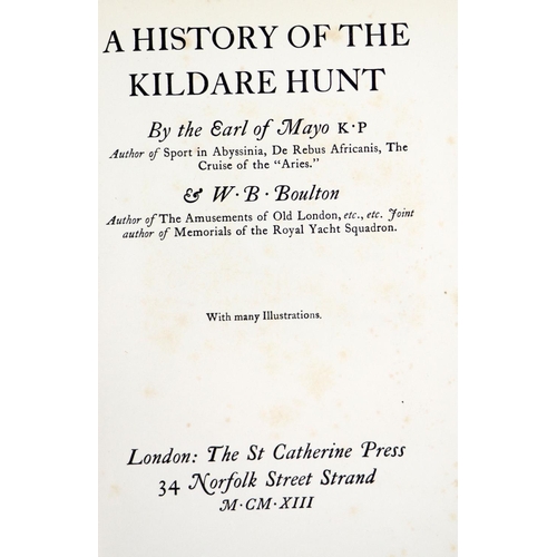Co. Kildare: Mayo (Earl of,) & Boulton (W.B.) A History of the Kildare Hunt, roy 8vo Lond. 1913. First Edn., port. frontis & many illus. of past masters paintings of The Hunt, & various properties, t.e.g., uncut in orig. crimson gilt decorated buckram. V. good copy. Scarce. (1)