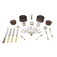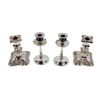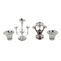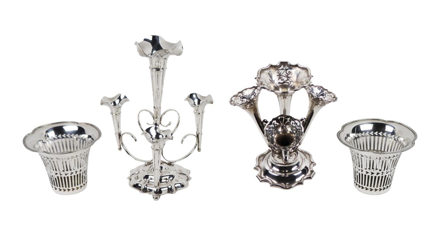 An English silver Epergne of trumpet and pierced form, on a shaped base, approx. 20cms (8") high by Walker & Hall, Sheffield, 1910, approx. 15 ounces; together with a larger plated Epergne with removable parts; and a pair of Edwardian plated pierced decorated Wine Coolers. (4)