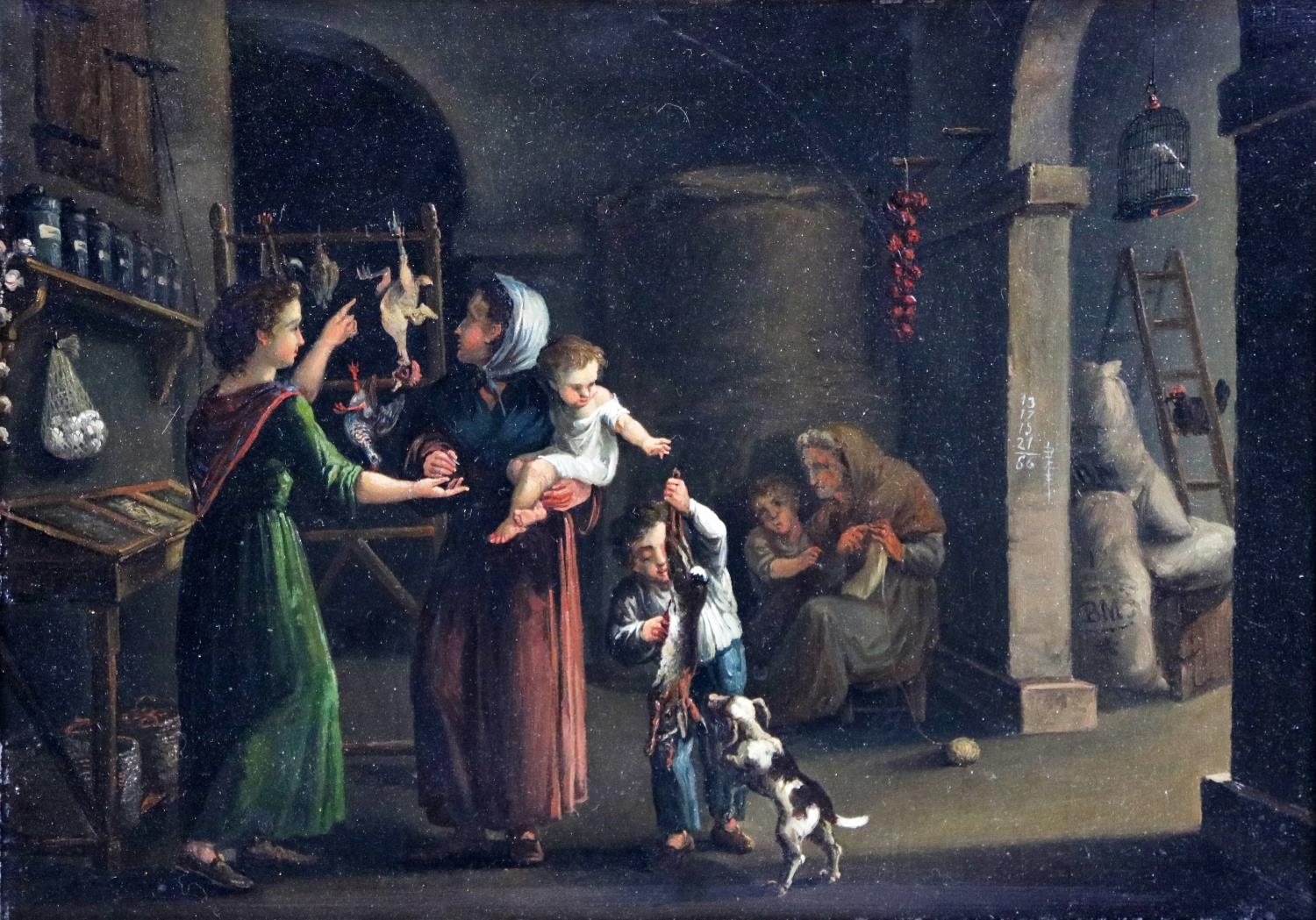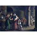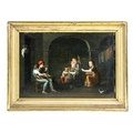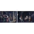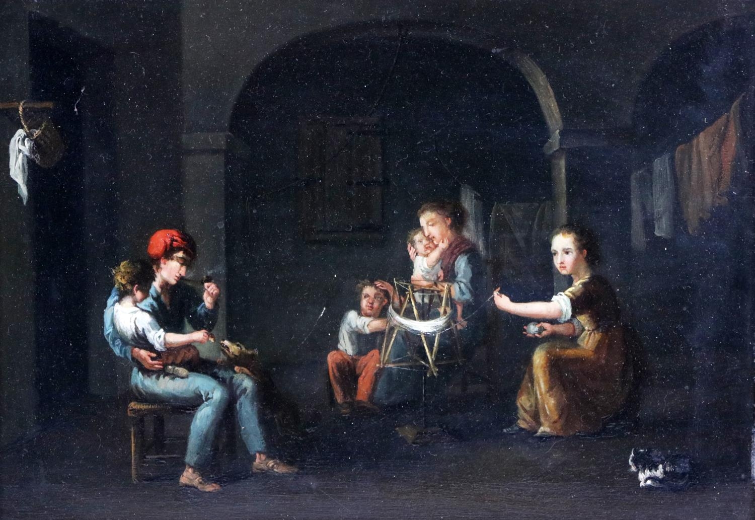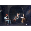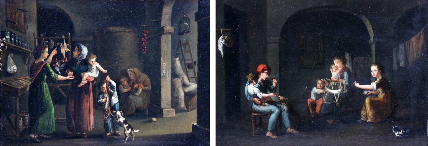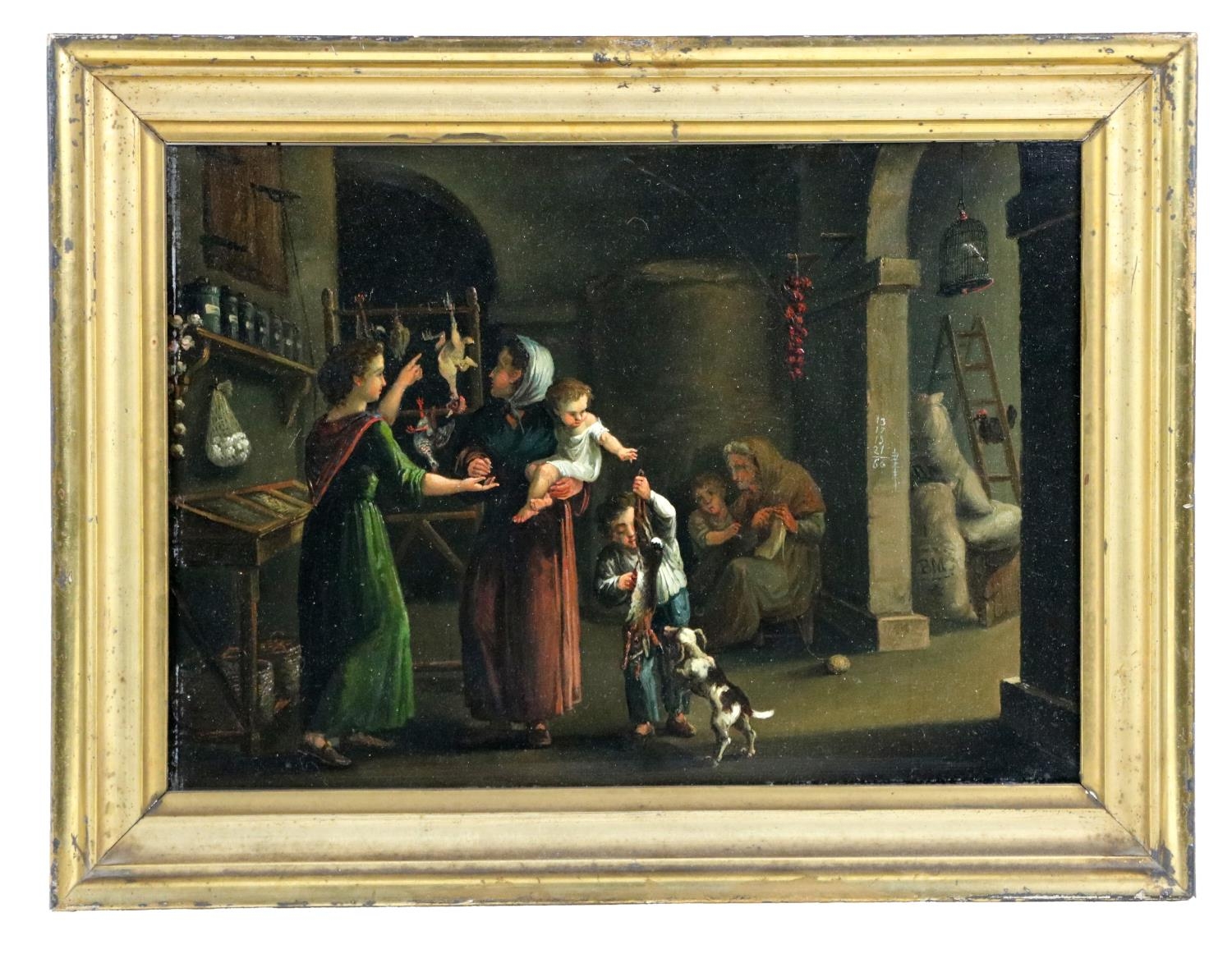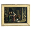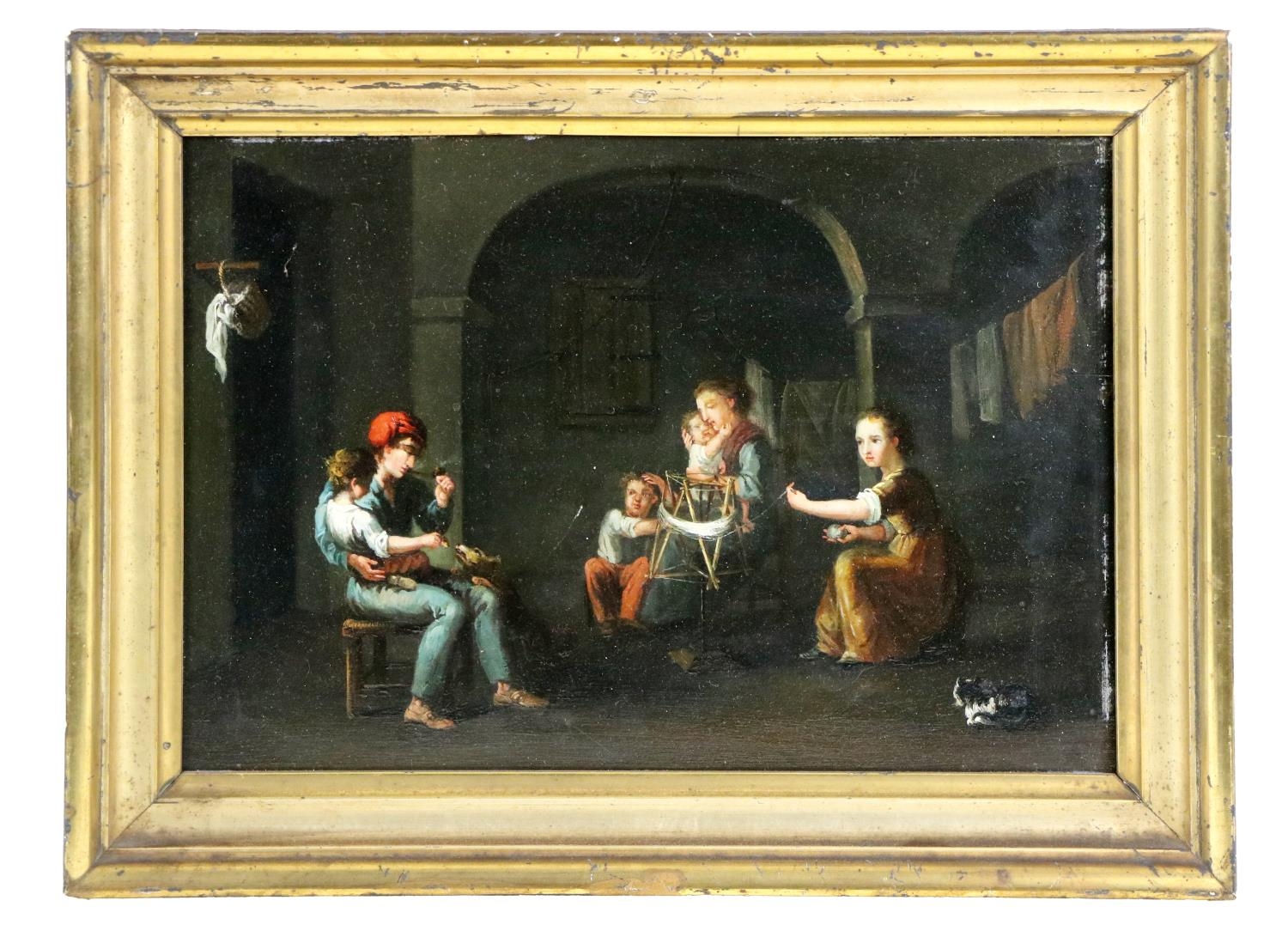 A pair of Interior Scenes depicting "Figures Working in the Kitchen," and another Interior Scene with "Father, Mother and Children," O.O.B., each approx. 21cms x 30cms (8 1/4" x 12") in matching gilt frames. (2)